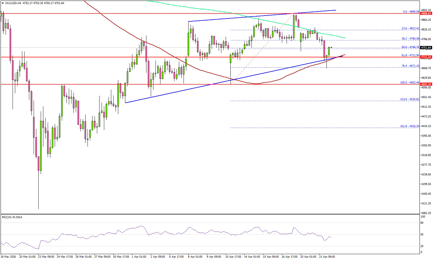 The 4-hour chart of XAU/USD indicates that the price even surpassed the $4,800 resistance zone and the 100 Simple Moving Average (red, 4 hours). Finally, the bears appeared near the $4,890 zone. The price trimmed some gains and traded below $4,800.