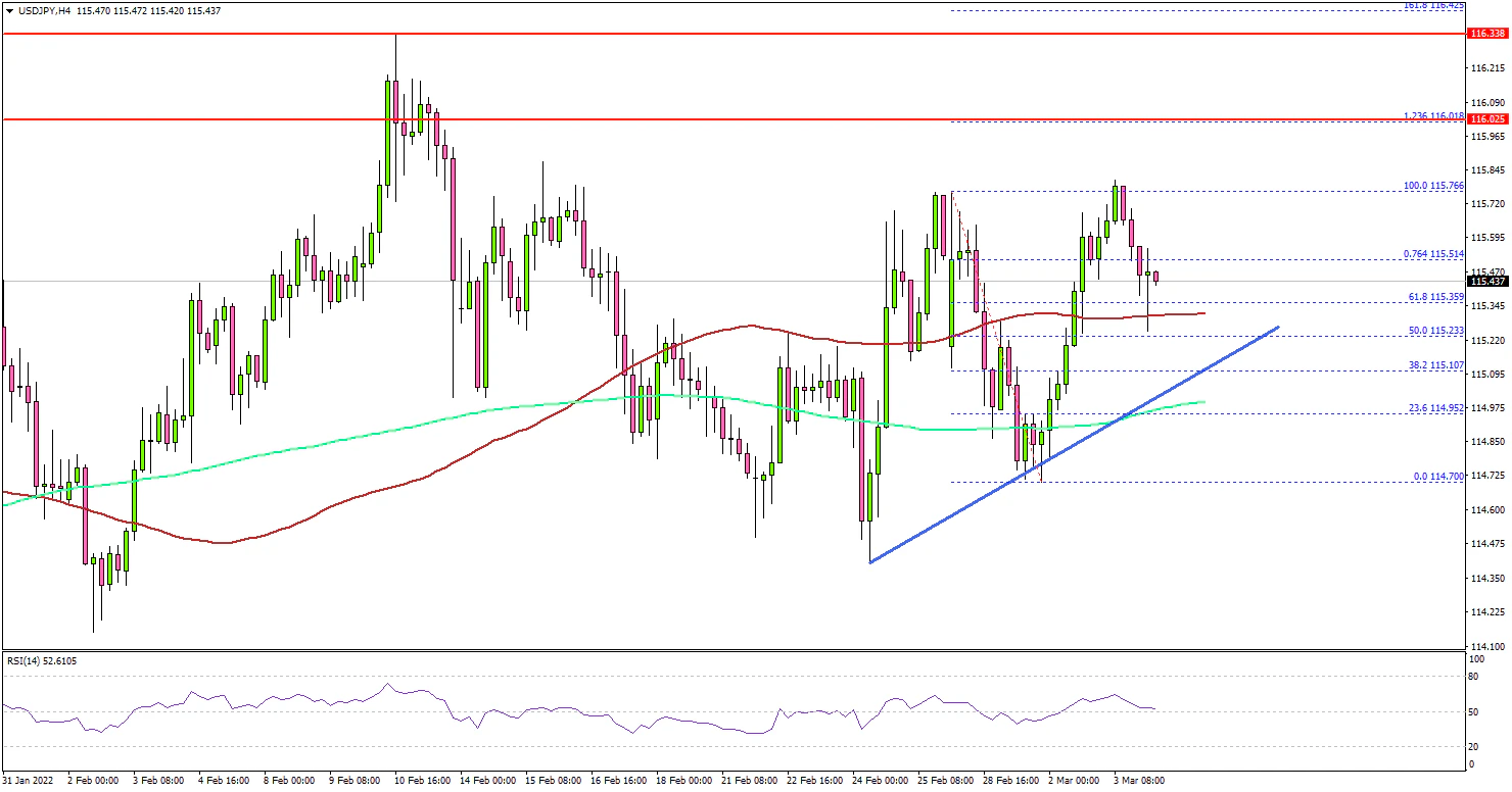 - A key bullish trend line is forming with support at 115.20 on the 4-hours chart.