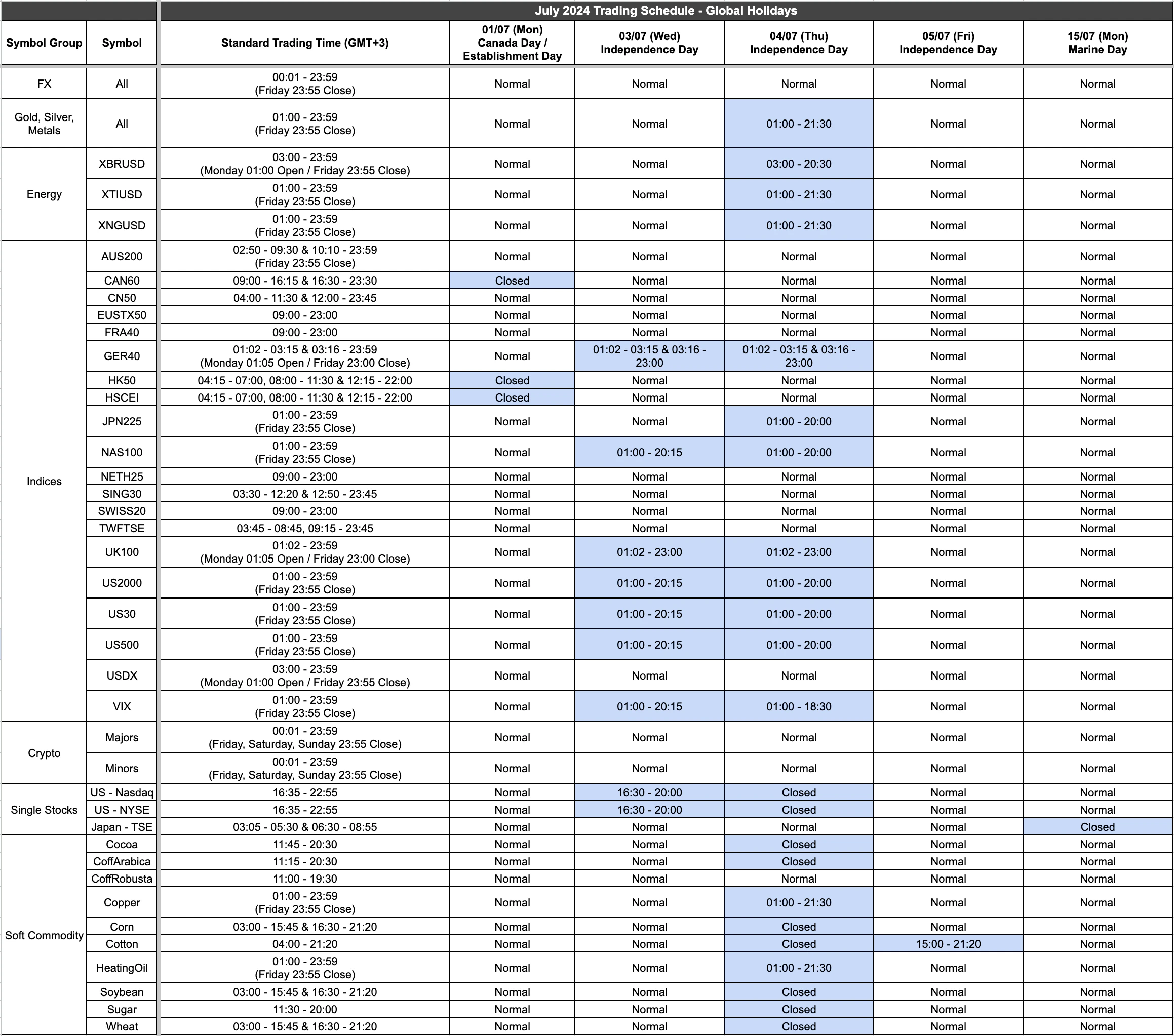 Unless indicated above the markets will be open as usual. Times shown are in the new GMT+3 server time.