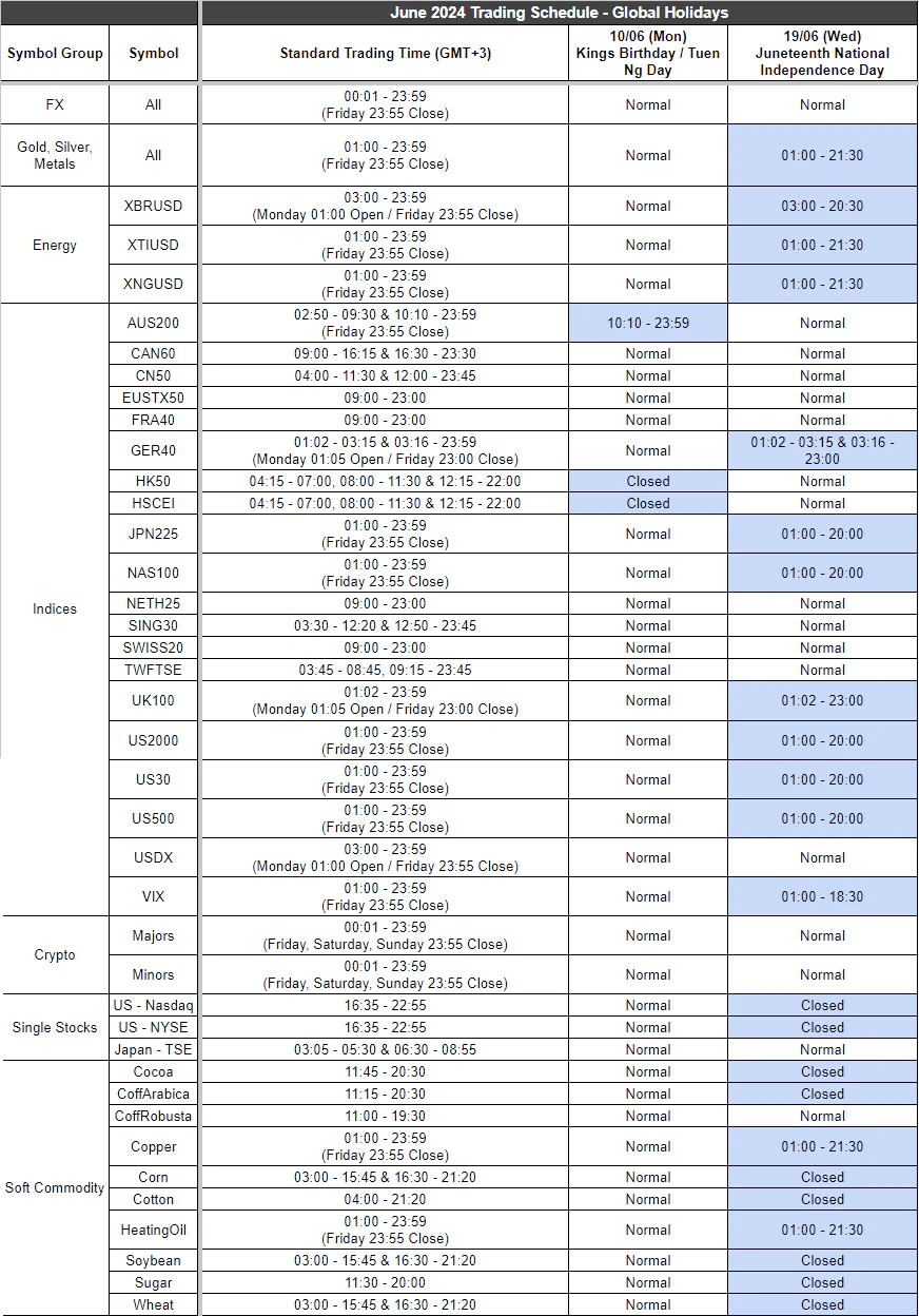 Due to King’s Birthday, Tuen Ng Day, and Juneteenth National Independence Day holidays, the market trading house for a number of tradable products will be altered in June.