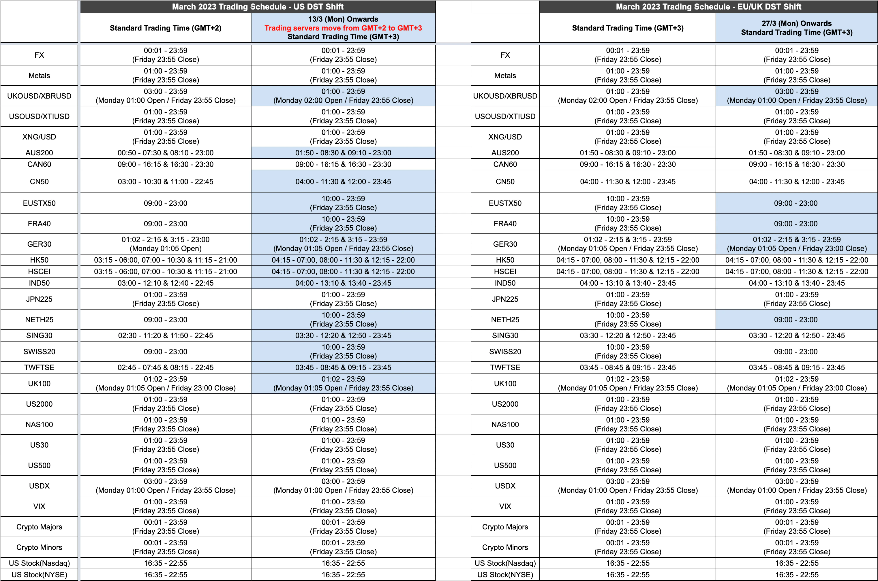 On the 13th March, US DST movement shifts the timezone of our MT4/MT5 trading servers from GMT+2 to GMT+3. The trading hours for some products will also change as a result.