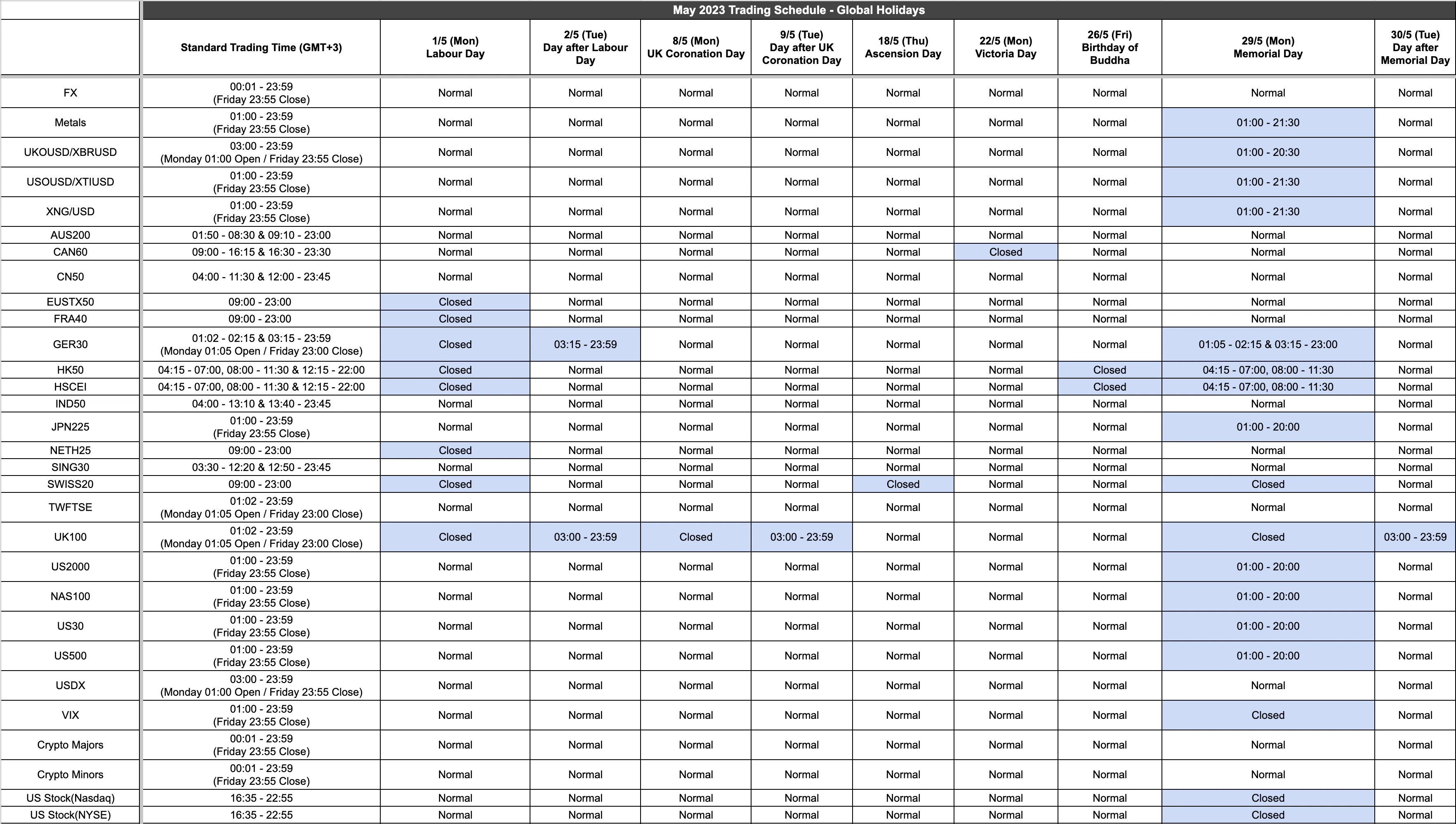 Unless indicated above the markets will be open as usual. Times shown are in the new GMT+3 server time.