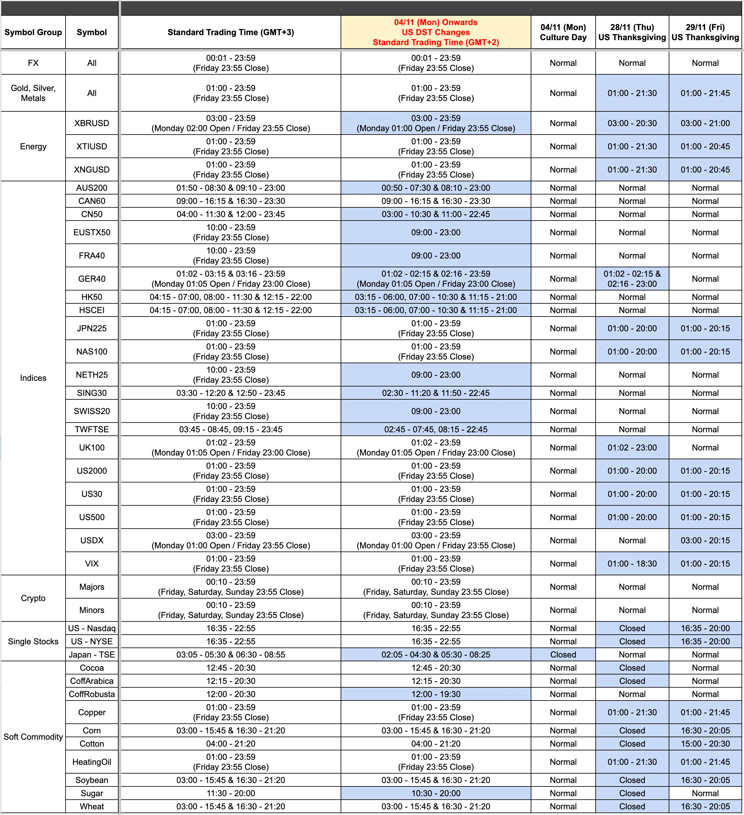 Due to the upcoming U.S. Daylight Saving Time change, our trading servers will shift from GMT+3 to GMT+2. As a result, trading hours for several products will be adjusted.