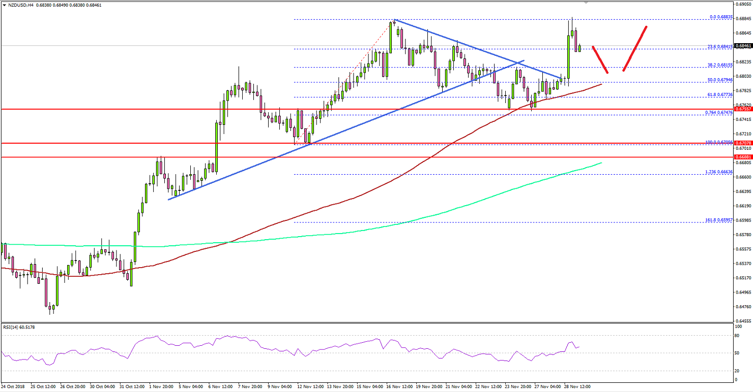 The New Zealand Dollar remained in a decent uptrend and traded above the 0.6750 and 0.6800 resistances. However, the NZD/USD pair faced sellers near 0.6880 and later started a downside correction.