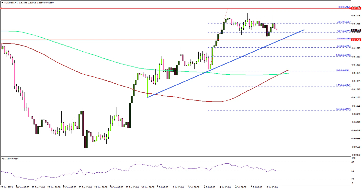 The pair even spiked above the 0.6200 level. A high is formed near 0.6212 and the pair is now consolidating gains. There was a minor decline below 0.6200. The pair dipped below the 23.6% Fib retracement level of the upward move from the 0.6141 swing low to the 0.6212 high.