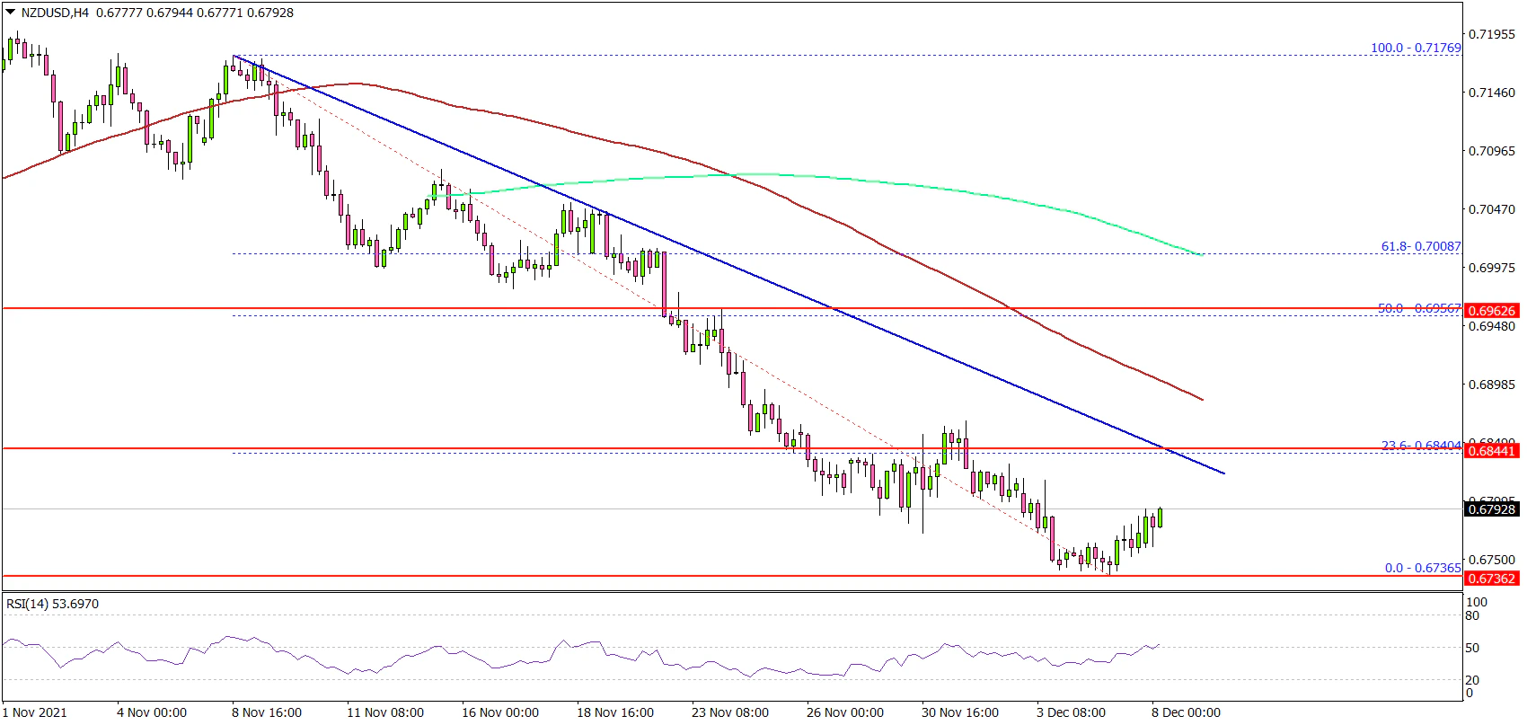 • A crucial bearish trend line is forming with resistance near 0.6840 on the 4-hours chart.