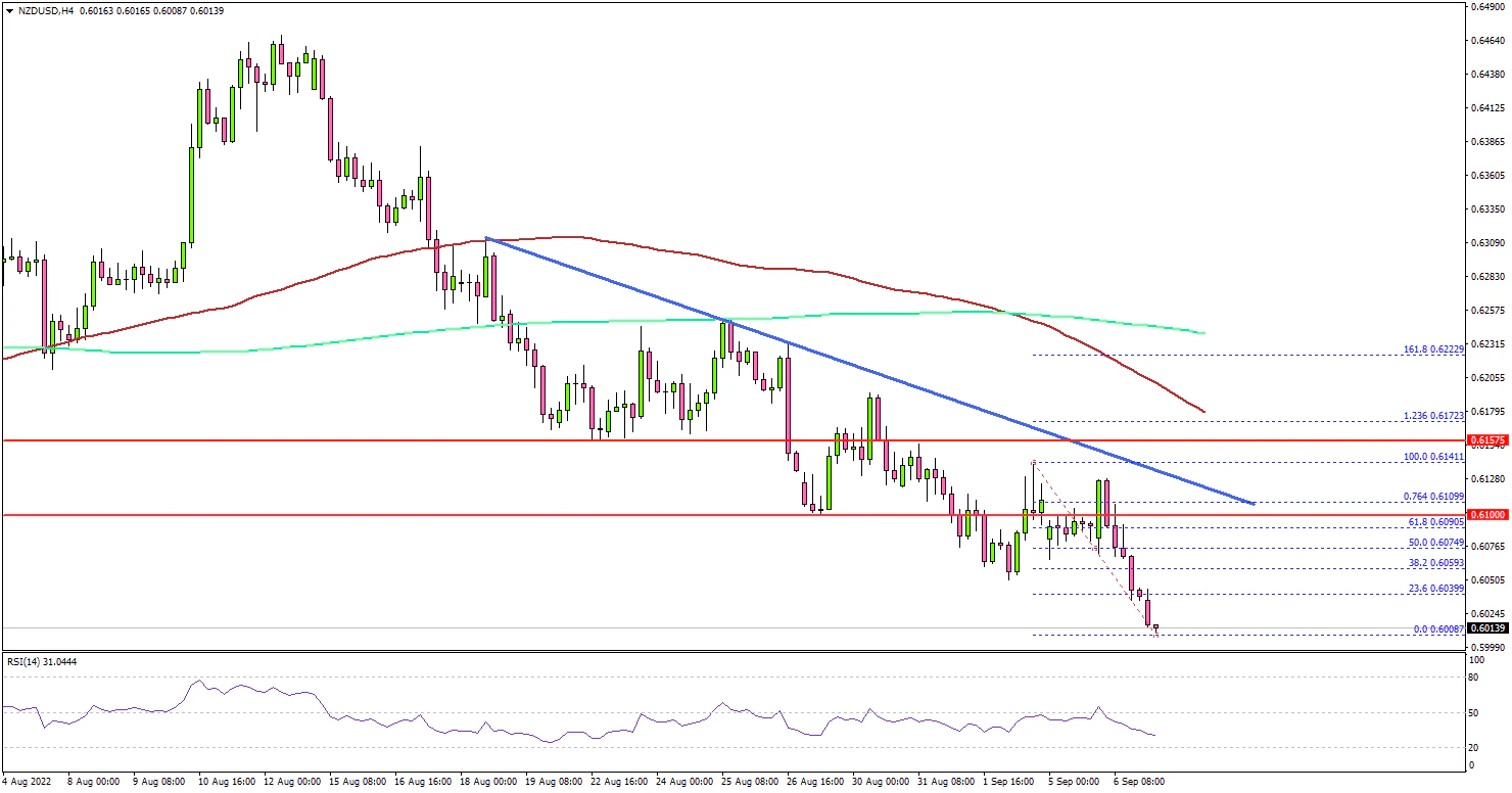- NZD/USD declined to a new multi-month low below 0.6100.