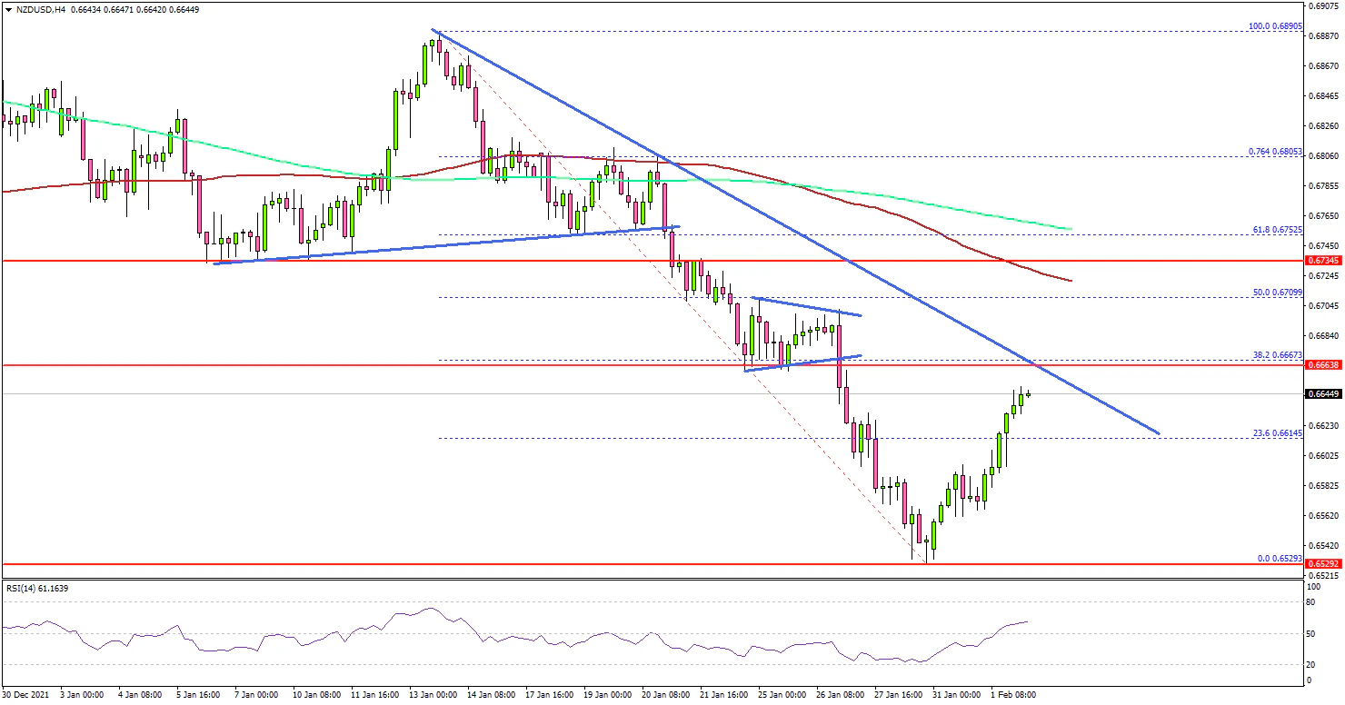It is now correcting losses and trading above 0.6580. It even moved above the 23.6% Fib retracement level of the downward move from the 0.6890 swing high to 0.6529 low.
