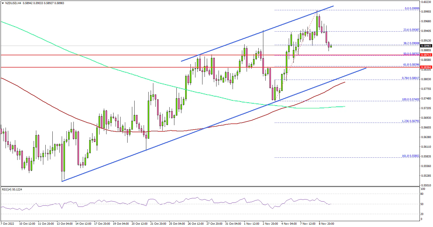 The bulls pushed the pair above the 0.5900 level. It traded as high as 0.5999 and failed to surpass the 0.6000 resistance zone. The pair is now correcting lower below 0.5950.