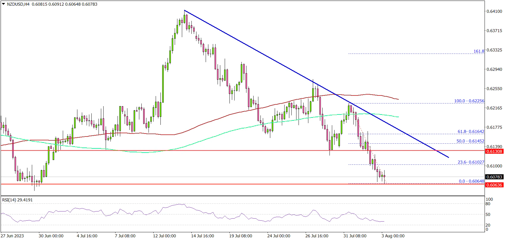 The pair is now consolidating near the 0.6065 zone. A downside break and close below the 0.6065 zone could set the pace for a sustained decline.