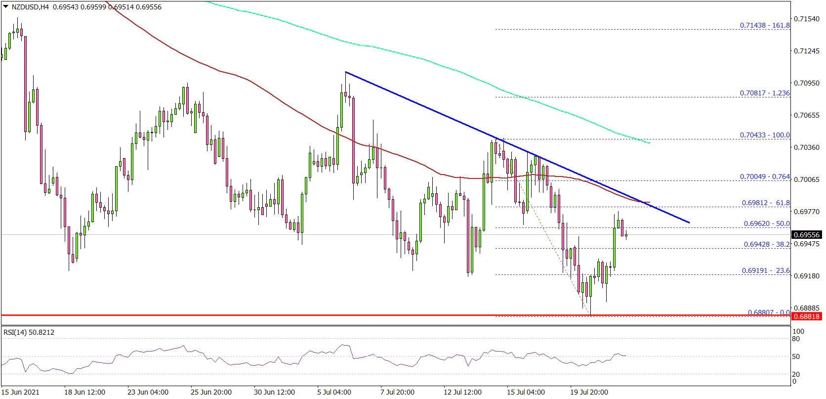 - A major bearish trend line is forming with resistance near 0.6980 on the 4-hours chart.