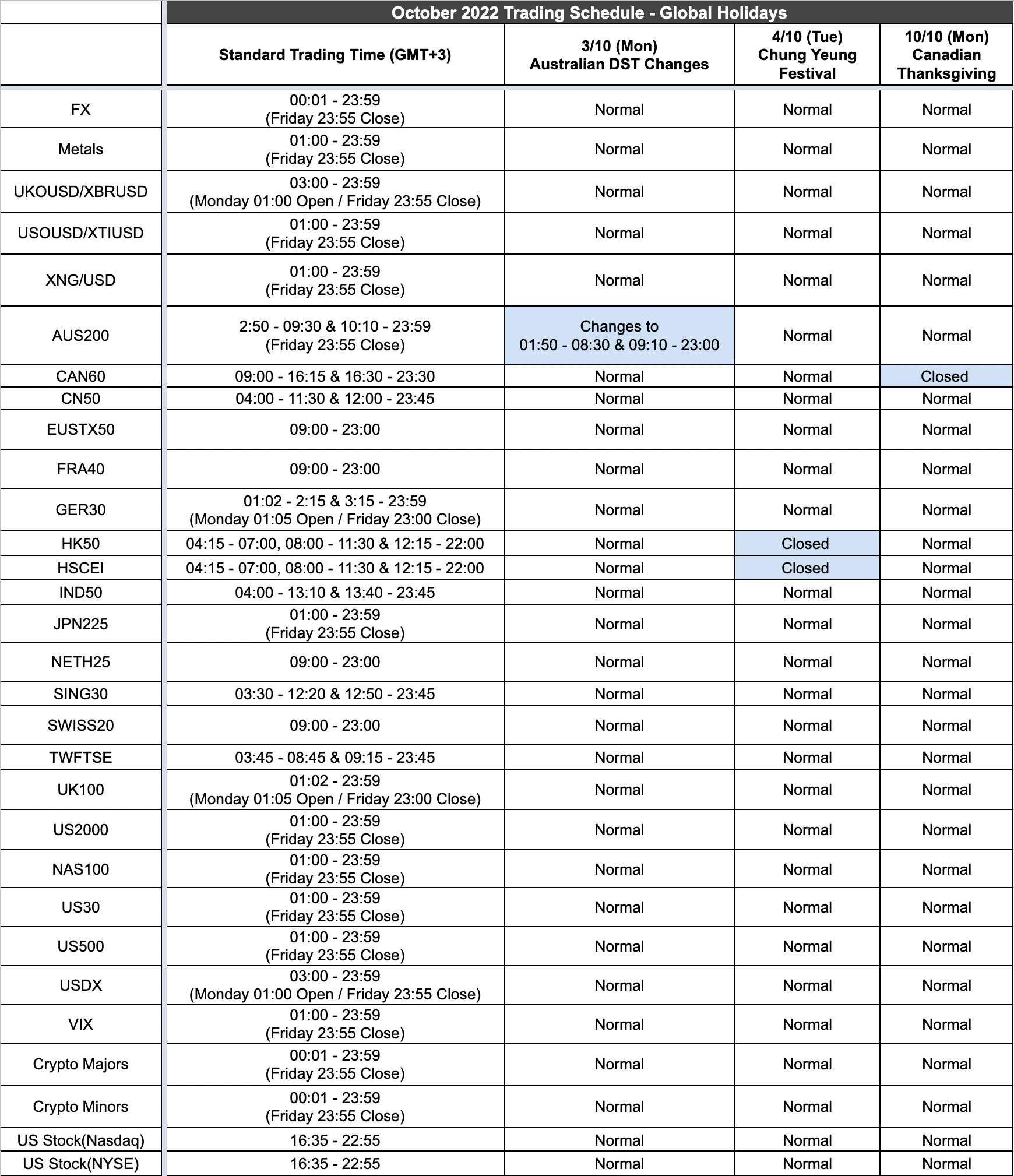 There are a number of global holidays to come in October including Chung Yeung Festival and Canadian Thanksgiving. Due to these holidays the market trading hours for a number of tradable products will be temporarily altered. AUS200 trading hours will also change from the 3rd onwards in line with Australia’s DST shift.