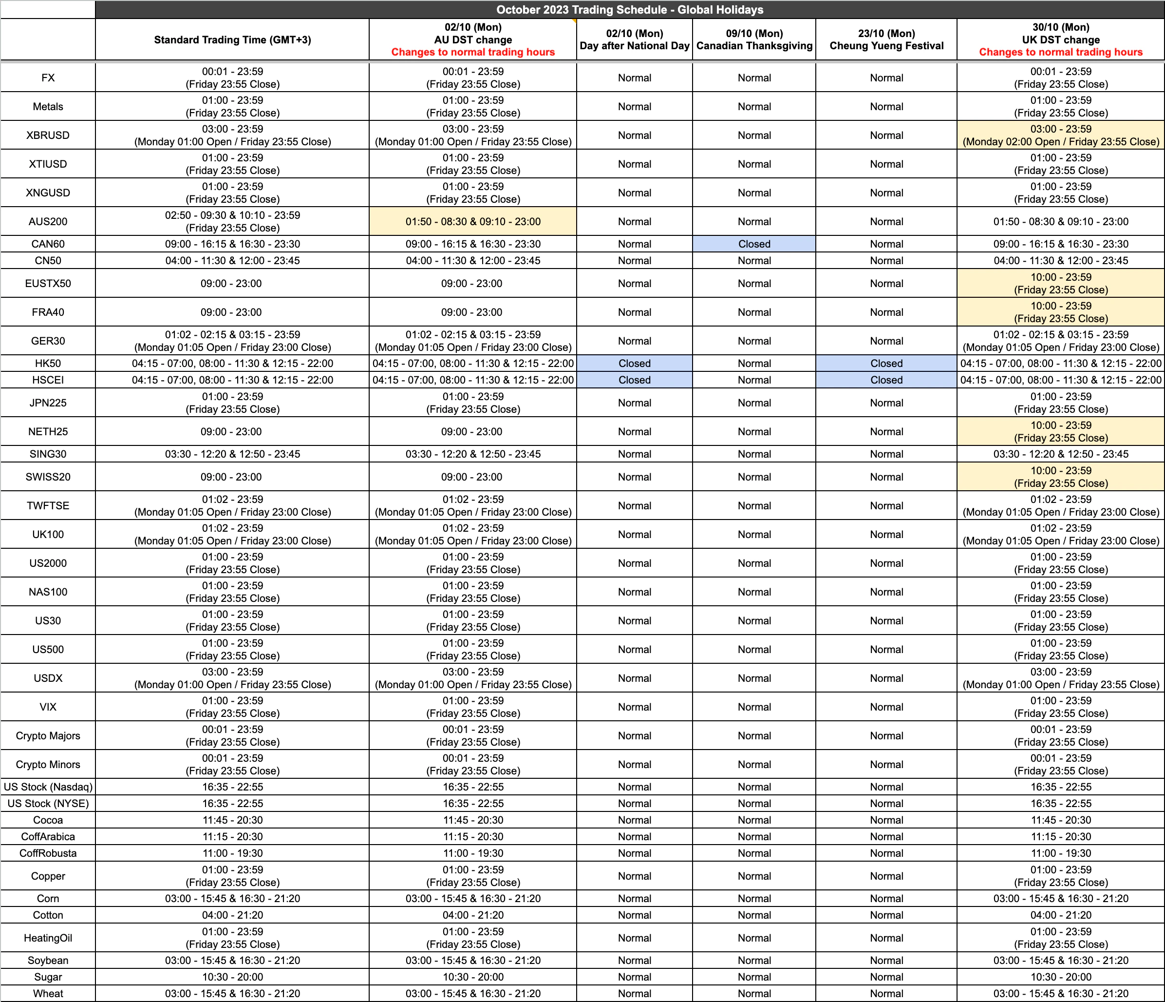 There are a number of global holidays to come in October including National Day, Canadian Thanksgiving, Chung Yeung Festival. Due to which the trading hours for a number of products will be temporarily altered.