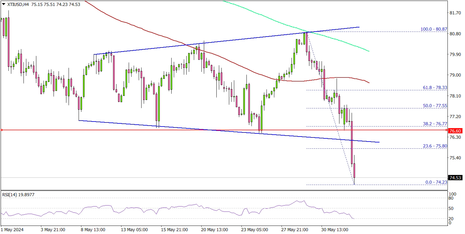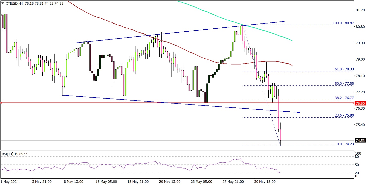 In the past few days, Crude oil prices saw a major decline below the $78.00 zone. The price dipped below the $76.80 and $76.20 support levels.