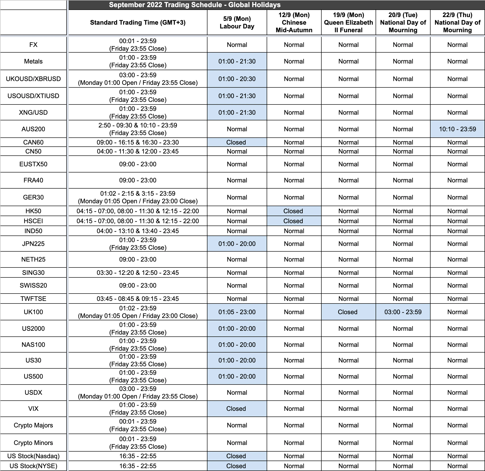 There are a number of global holidays to come in September including Labour Day Holiday, Chinese Mid-Autumn Festival, Queen Elizabeth II Funeral and National Day of Mourning. Due to these holidays the market trading hours for a number of tradable products will be temporarily altered.