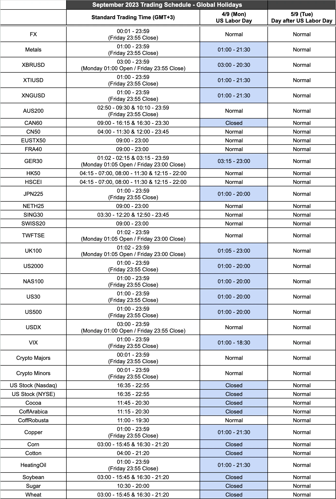 There is US Labor Day in the month of September. Due to this holiday the trading hours for a number of products will be temporarily altered.