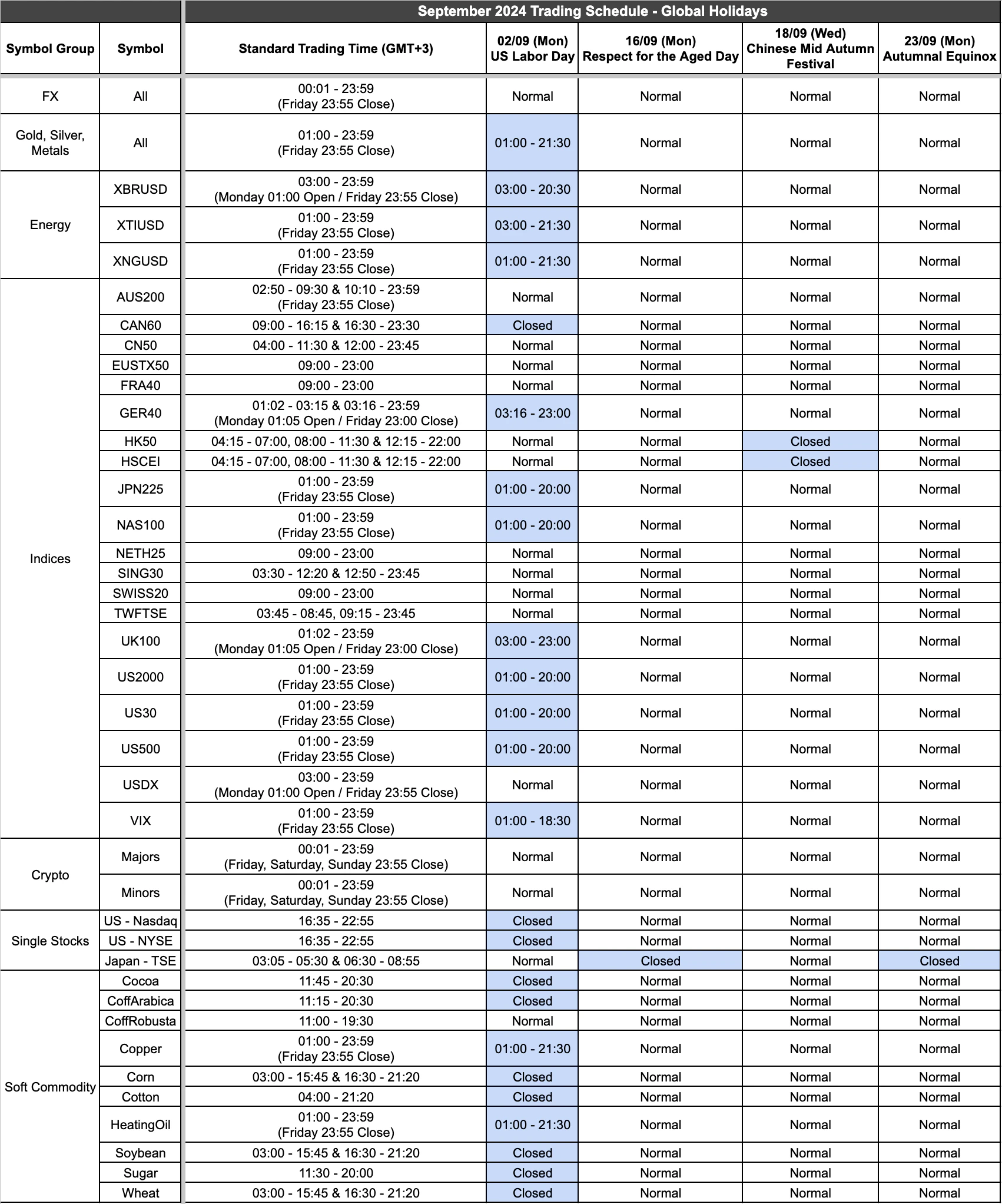 Due to US Labour Day, Respect of the Aged Day, Chinese Mid-Autumn Day, and Autumn Equinox, the market trading house for a number of tradable products will be altered in September.