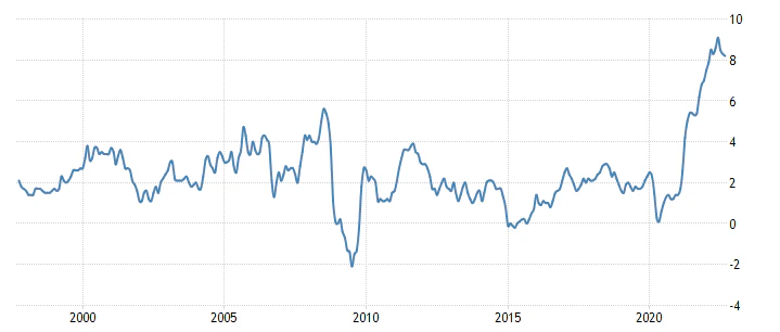 2022 has seen inflation increase around the world and especially in the US. Inflation is when the prices of goods and services rise in an economy. The below shows the yearly US inflation rate over the past 25 years.