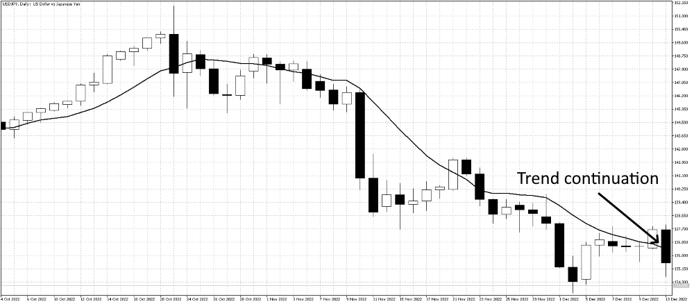 A trend continuation buy signal occurs in an uptrend when prices move back above the upward-pointing moving average. On the other hand, in a downtrend, the sell signal is when prices move back below the moving average.