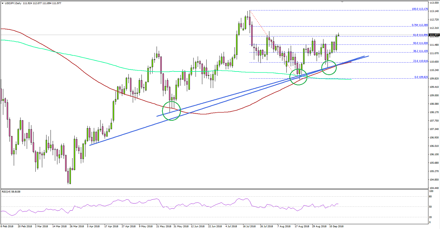 Looking at the daily chart, the pair started a fresh upward move from the 110.40 swing low. It seems like the 110.00 zone is a strong support along with the 100-day simple moving average (red).More importantly, the pair found bids near two key bullish trend lines in place with current support near 110.80 on the same chart. The pair moved above the 111.50 resistance and the 50% Fib retracement level of the last drop from the 113.17 high to 109.82 low.If the pair accelerates above the 112.00 and 112.10 resistance levels, there could be a test of the 76.4% Fib retracement level of the last drop from the 113.17 high to 109.82 low at 112.38. Above 112.40, the pair will most likely retest the last swing high at 113.17.On the flip side, if there is a downside correction, the 111.00 level is an initial support, followed by the trend lines at 110.80.Fundamentally, the US Consumer Price Index for August 2018 was released by the US Bureau of Labor Statistics. The market was looking for a rise of 0.3% in the CPI compared with the previous month.However, the result was disappointing as the CPI increased 0.2% and the yearly change came in at 2.7%, less than the forecast of 2.8%. Looking at the Consumer Price Index (CPI) Ex Food & Energy, there was a rise of 2.2% (YoY), less than the 2.4% forecast.The report added: