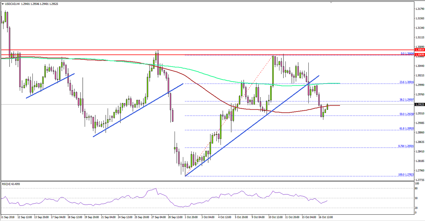 Looking at the 4-hours chart, the pair clearly failed on a few occasions to break the 1.3070-1.3080 resistance. It declined and broke the 23.6% Fib retracement level of the last wave from the 1.2782 low to 1.3069 high.More importantly, the pair broke a major bullish trend line with support at 1.3010 on the 4-hours chart. Additionally, there was a close below the 1.3000 support and the 200 simple moving average (green, 4-hours).On the downside, the next important support is at 1.2920 and the 50% Fib retracement level of the last wave from the 1.2782 low to 1.3069 high. If there is a break below 1.2920, the pair could move into a bearish zone and it might decline towards 1.2850.On the other hand, if there is an upward move, the pair needs to clear the 1.3000 resistance and the 200 SMA to revisit the 1.3070 resistance zone.Fundamentally, the US Industrial production report for Sep 2018 was released by the Board of Governors of the Federal Reserve. The market was looking for a rise of around 0.3% in the production compared with the previous month.The actual result was similar to the forecast, but it was less than the last increase of 0.4%. Looking at the total industrial production at an annual rate, there was a rise of 3.3% in September 2018.The report added that:Output growth in September was held down slightly by Hurricane Florence, with an estimated effect of less than 0.1 percentage point.Overall, the US Dollar may continue to move down and pairs like EUR/USD and GBP/USD could benefit in the short term.
