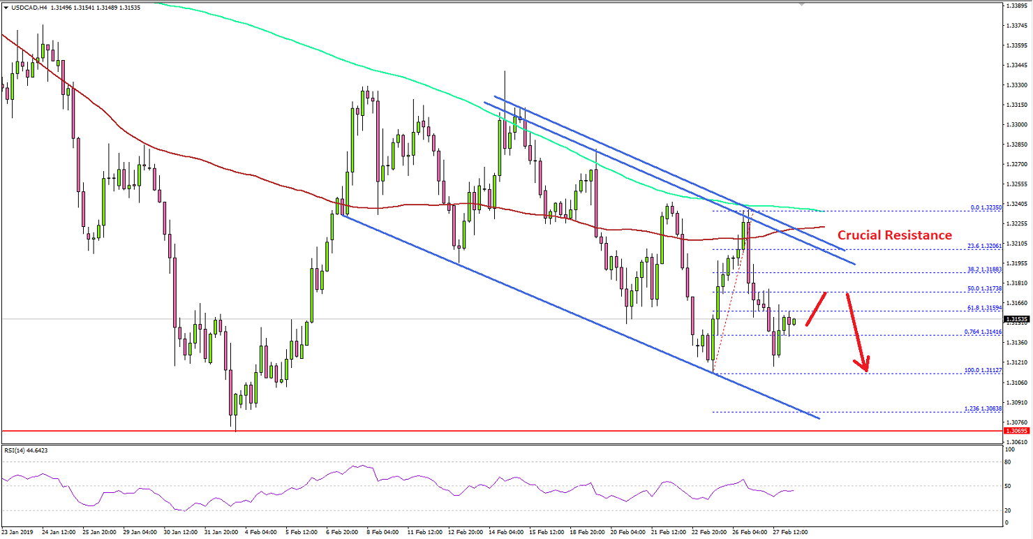 The US Dollar formed a significant top near the 1.3300 level against the Canadian Dollar. The USD/CAD pair started a major decline and broke the key 1.3200 support to enter a bearish zone.USDCAD Technical Analysis US Dollar Canadian DollarLooking at the 4-hours chart, the pair broke many supports and settled below 1.3220 plus 1.3200. There was also a close below the 100 (red) simple moving average (4-hours). The last correction was capped near the 1.3230 level and later the price declined below 1.3185.There was a break below the 61.8% and 76.4% Fib retracement levels of the last wave from the 1.3112 low to 1.3235 high. The recent decline has opened the doors for more losses below the 1.3110 and 1.3100 support levels.The next stop for sellers could be 1.3080 and the 1.236 Fib extension level of the last wave from the 1.3112 low to 1.3235 high. To the topside, there are many hurdles for buyers near the 1.3180, 1.3190 and 1.3200 levels.More importantly, there a crucial declining channel in place with resistance at 1.3200 on the same chart. Therefore, a break and close above 1.3200 plus the 100 (red) simple moving average (4-hours) is must for a fresh upward move towards 1.3300. If not, there is a risk of more losses towards 1.3080 and 1.3050.Fundamentally, the Canadian Consumer Price Index (CPI) report for Jan 2019 was released by the Statistics Canada. The market was looking for a 0.2% increase in the CPI in Jan 2019, compared with the previous month.However, the result was lower than the forecast as the CPI increased 0.1%. The yearly change was 1.4%, less than the 1.5% forecast and a lot less than the last 2.0%.Canada CPI Jan 2019The report added that: