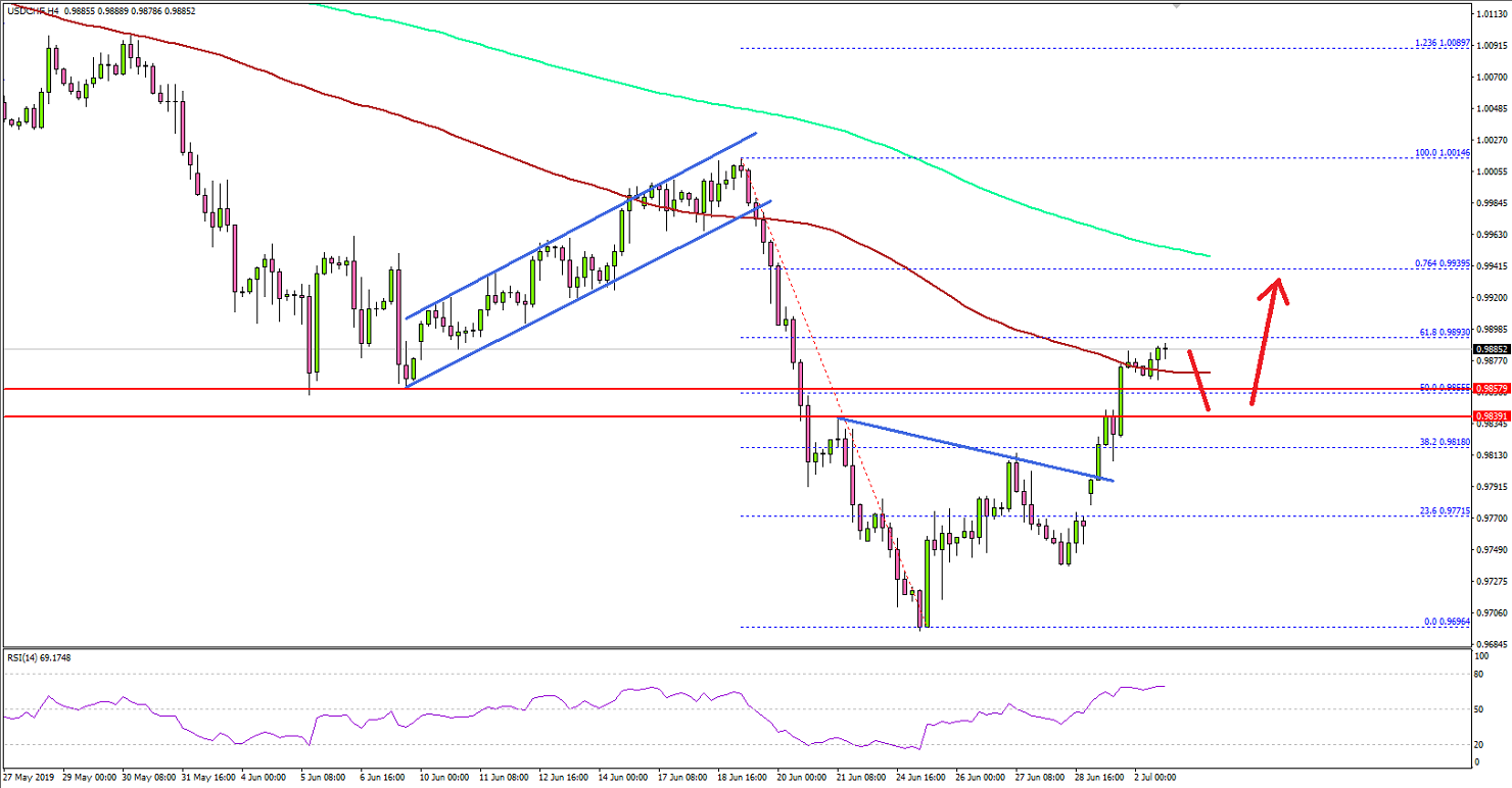 • USD/CHF traded above a bearish trend line withresistance near 0.9790 on the 4-hours chart.