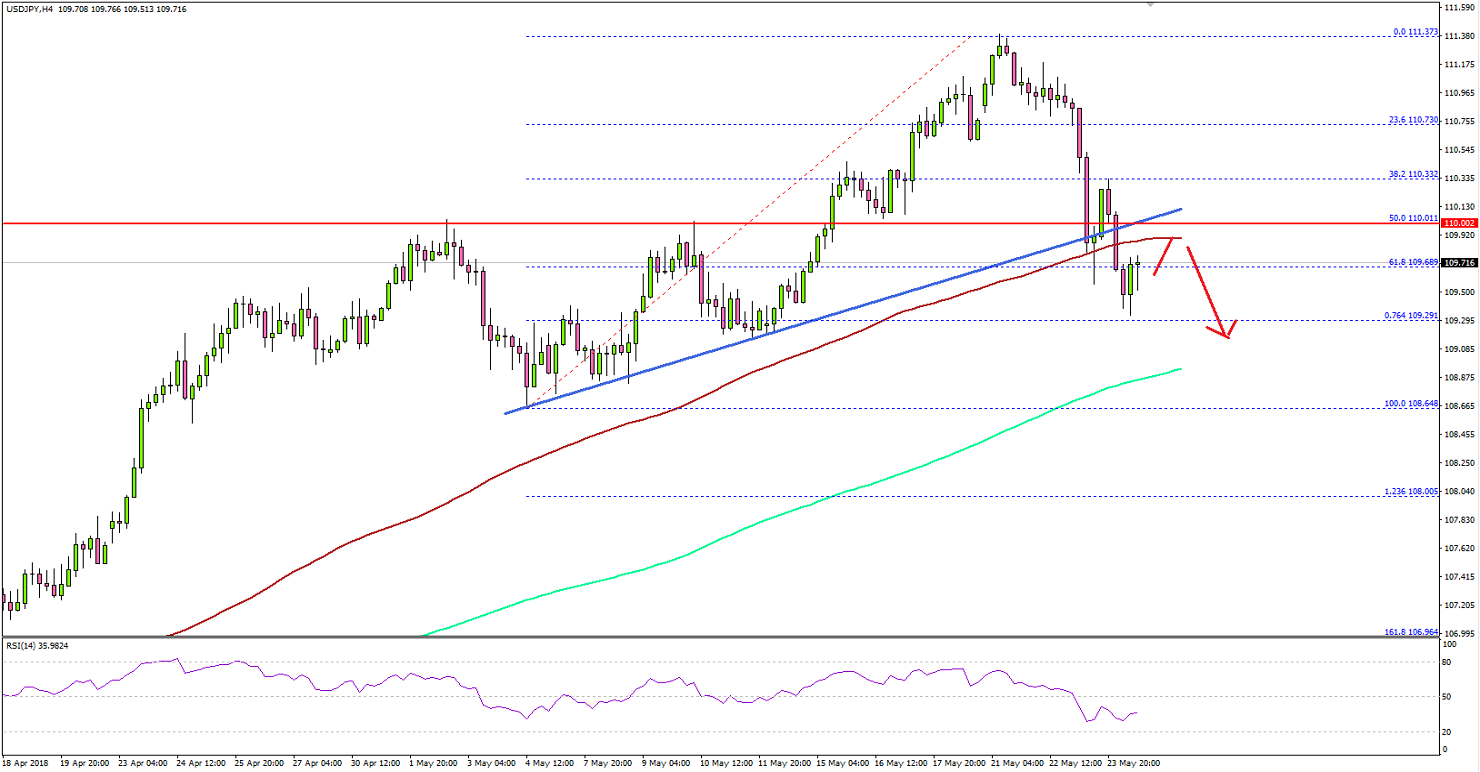 The US Dollar started a downside move after topping around the 111.35 level against the Japanese Yen. It seems like the USD/JPY pair has started a major correction and it could extend declines below 110.00.USDJPY Technical Analysis US Dollar Japanese YenLooking at the 4-hours chart, the pair declined from 111.37 and moved below the 50% Fib retracement level of the last wave from the 108.64 low to 111.37 high. More importantly, there was a break below a key bullish trend line with support at 110.05 on the 4-hours chart.The pair also broke the 100 simple moving average (red, 4-hour) and 109.80. It almost tested the 76.4% Fib retracement level of the last wave from the 108.64 low to 111.37 high.The current price action suggests that the pair broke a key support near 110.00, which may now act as a resistance. If the pair moves back above 110.00, it will most likely resume its uptrend. On the downside, a break below 109.30 and 109.20 could push the pair towards 108.80.Recently in the US, the Initial Jobless Claims for the week ending May 19, 2018 was released by the US Department of Labor. The market was looking for a decline in claims from 222K to 220K.However, the result was disappointing as there was a rise in claims to 234K. Moreover, the last reading was revised up to 223K. The report added: