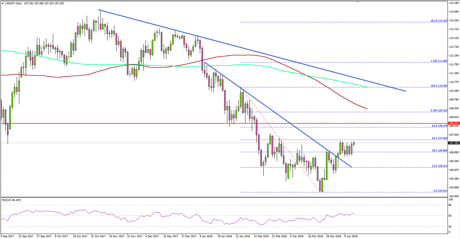 The US Dollar started an upside move after trading as low as 104.63 against the Japanese Yen. The USD/JPY broke a few resistances such as 105.00 and 106.00 to move back in a positive zone.USDJPY Technical Analysis US Dollar Japanese YenLooking at the daily chart, the pair broke the 23.6% Fib retracement level of the last decline from the 110.48 high to 104.63 low. Moreover, there was a break above a significant bearish trend line with resistance at 106.35.It opened the doors for more gains with a close above the 106.50 pivot level. Going forward, the pair has to break the 107.60 resistance, and the 50% Fib retracement level of the last decline from the 110.48 high to 104.63 low to gain bullish momentum.The next major hurdle for buyers is near the 108.40 level, which was a support earlier. On the downside, supports are at 106.50 and 106.20.Recently in the US, the Initial Jobless Claims for the week ending April 7th, 2018 was released by the US Department of Labor. The market was positioned for decline in claims from 242K to 230K.The actual result a bit on the lower side, as the decline in claims was less at 233K. Still, there was a decrease of 9K in claims, which is a positive sign. The report added that: