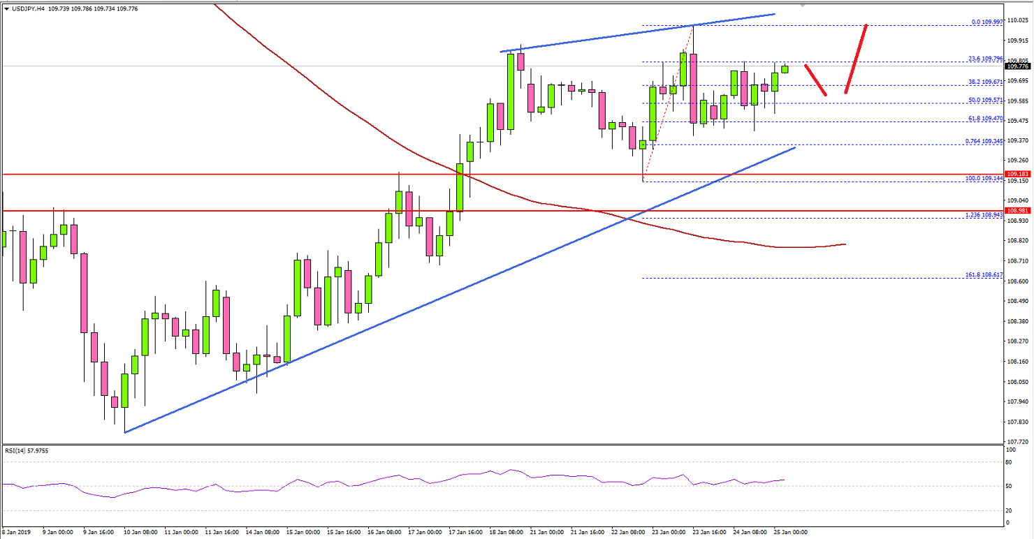Looking at the 4-hours chart, the pair recently climbed higher from the 109.14 low and traded as high as 109.99. Later, the pair corrected lower and traded below the 109.60 support plus the 50% Fib retracement level of the last wave from the 109.14 low to 109.99 high.However, the decline was protected by the 109.40-109.50 support and the 61.8% Fib retracement level of the last wave from the 109.14 low to 109.99 high. More importantly, there is a crucial bullish trend line formed with support at 109.30.Therefore, if the pair declines further, it is likely to find a strong buying interest above the 109.20 pivot level. Alternatively, if there is a downside break below 109.20 and 109.00, the pair could decline towards the 108.80 level and the 100 simple moving average (red, 4-hours).On the upside, the main resistance is near the 110.00 level, above which the pair is likely to gain strength for more gains towards the 111.20 and 111.40 levels.Fundamentally, the US Initial Jobless Claims figure for the week ending Jan 19, 2019 was released. The market was looking for a rise in claims from the last reading of 213K to 220K.The actual result was way better than the forecast as there was a drop in jobless claims to 199K (the lowest level for initial claims since November 15, 1969). Moreover, the last reading was revised down from 213K to 212K. The report stated that:The 4-week moving average was 215,000, a decrease of 5,500 from the previous week's revised average. The previous week's average was revised down by 250 from 220,750 to 220,500.Overall, the US Dollar might correct a few pips, but it remains well supported for more gains above 111.00 versus the Japanese Yen. More importantly, EUR/USD faced an increased selling pressure and declined below 1.1360, while GBP/USD stayed above the 1.2950 support.