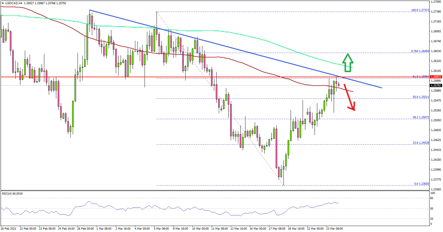 There is also a crucial bearish trend line forming with resistance near 1.2600 on the same chart. The next major resistance is near the 1.2620 level and the 200 simple moving average (green, 4-hours).