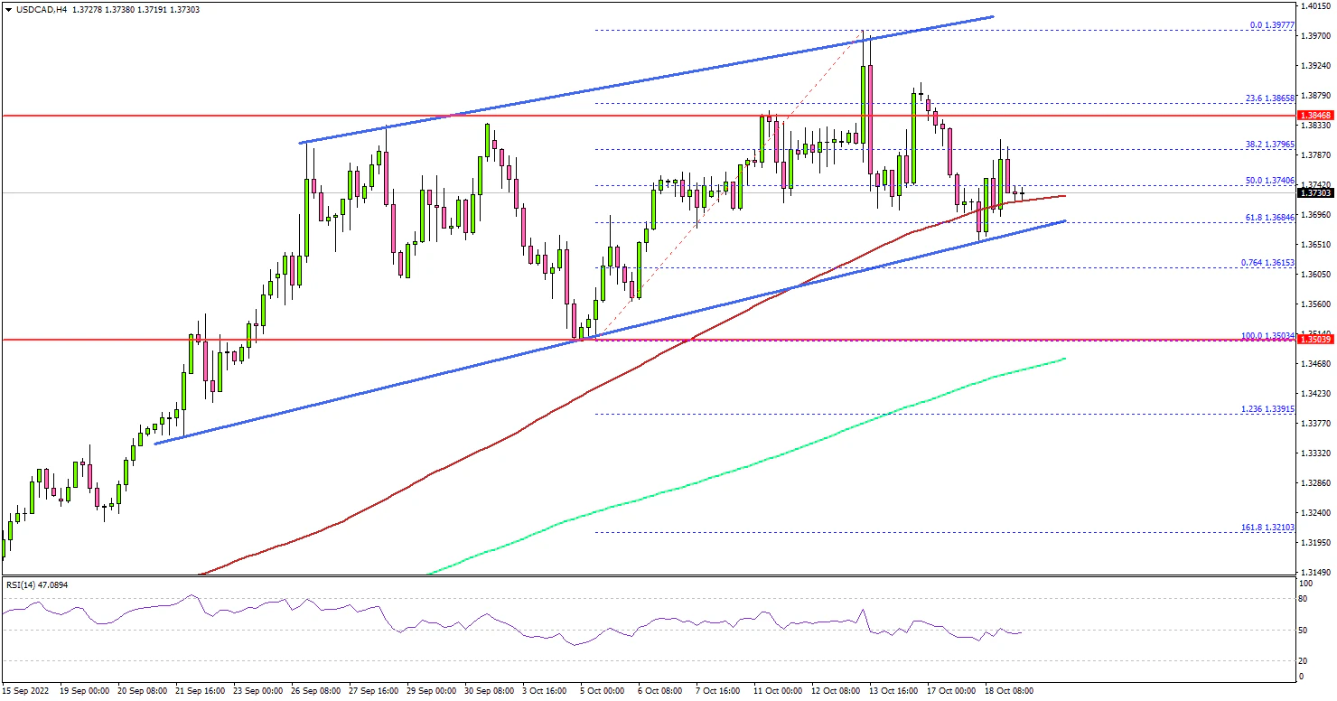 Looking at the 4-hours chart, the pair formed a top near the 1.3977 level. It started a downside correction below the 1.3900 level. The pair declined below the 50% Fib retracement level of the upward move from the 1.3503 swing low to 1.3977 high.