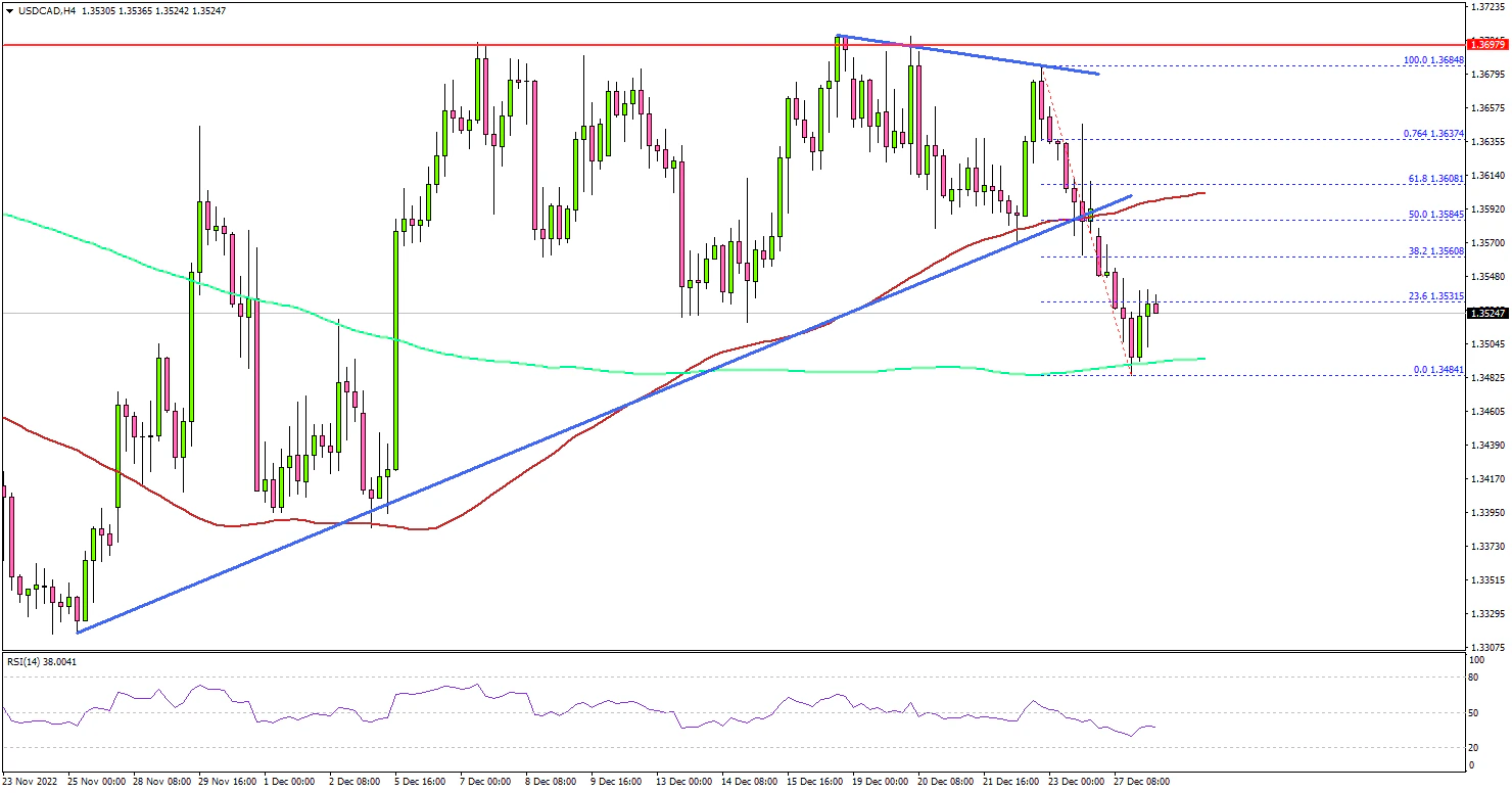 - USD/CAD started a fresh decline from the 1.3685 zone.