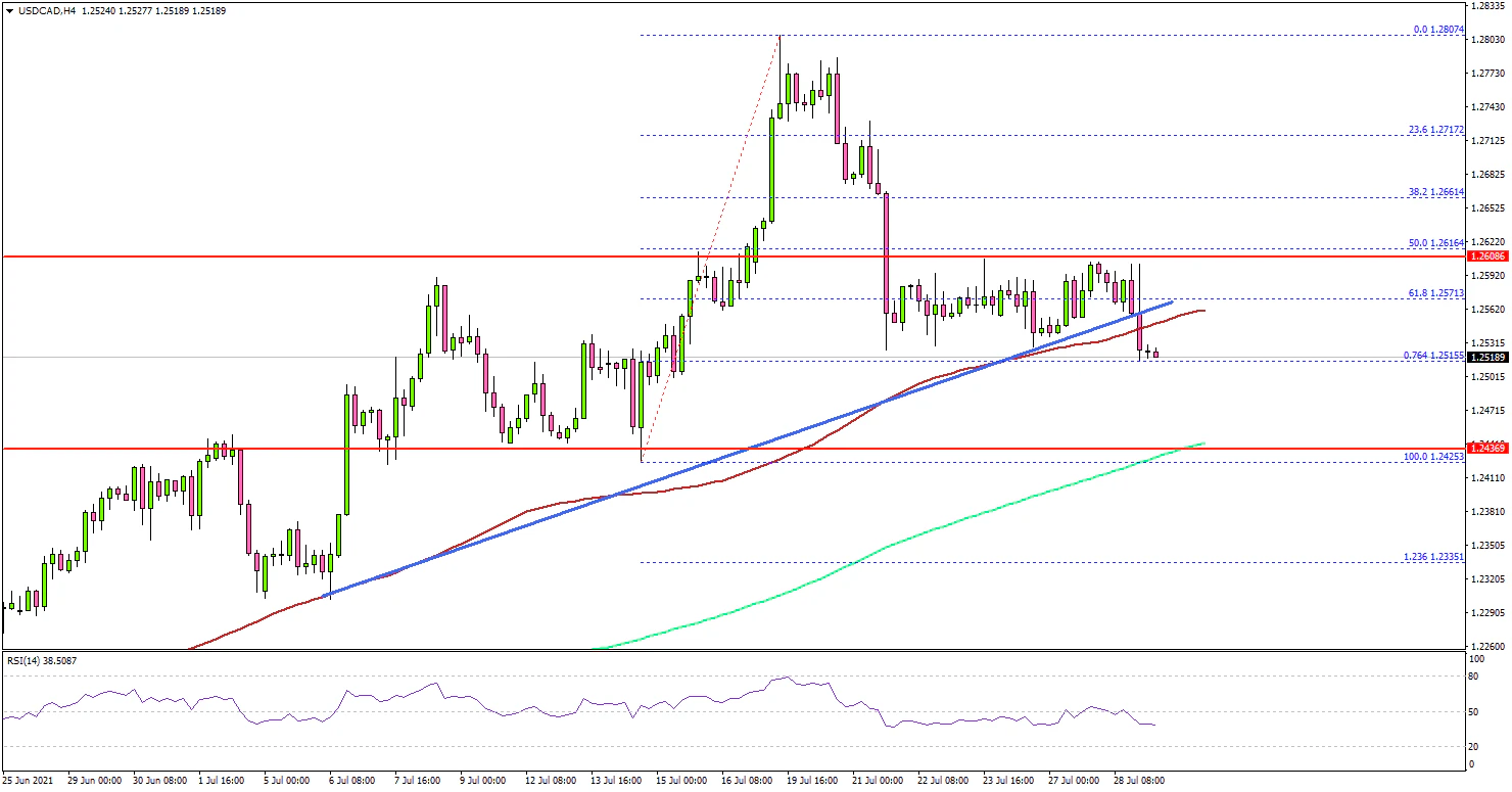 There was also a break below a key bullish trend line with support near 1.2560. The pair is now consolidating near the 1.2515 support.