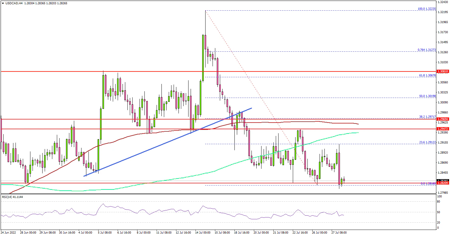 The pair is now consolidating losses above the 1.2850 level. On the upside, the pair is facing a major resistance near the 1.2960 zone and the 100 simple moving average (red, 4-hours).