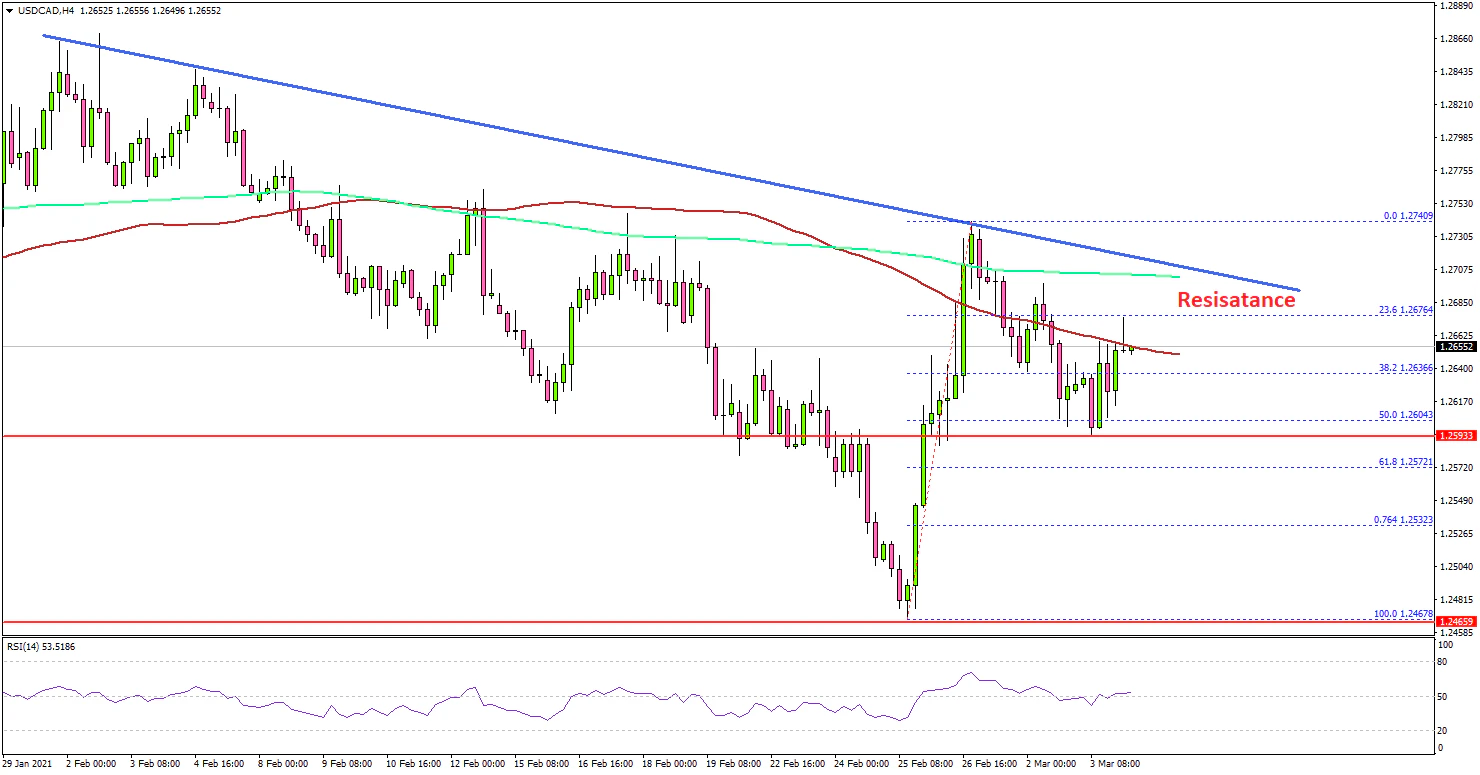 - A major bearish trend line is forming with resistance near 1.2700 on the 4-hours chart.
