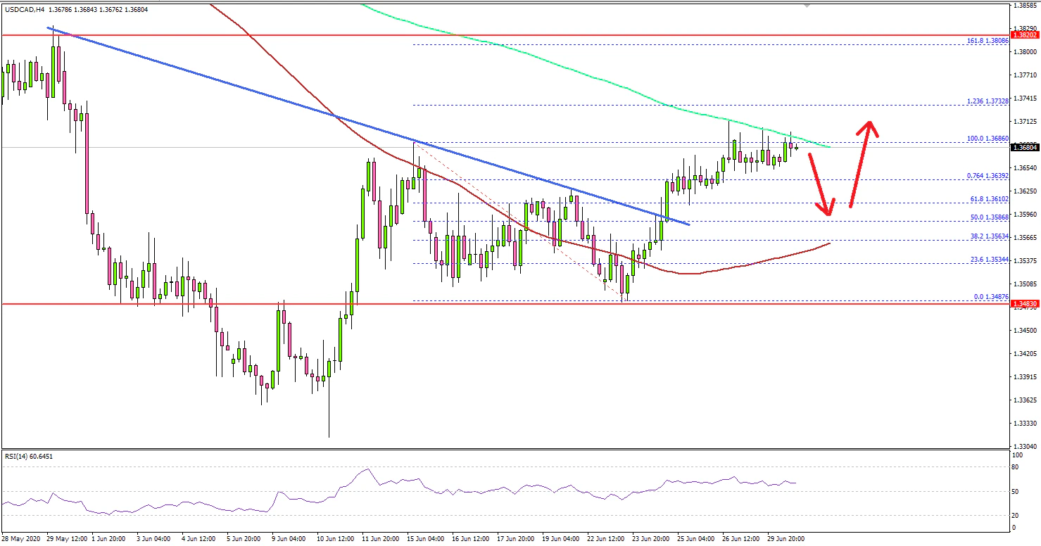 Looking at the 4-hours chart, the pair even climbed above the 1.3620 resistance and settled well above the 100 simple moving average (red, 4-hours).