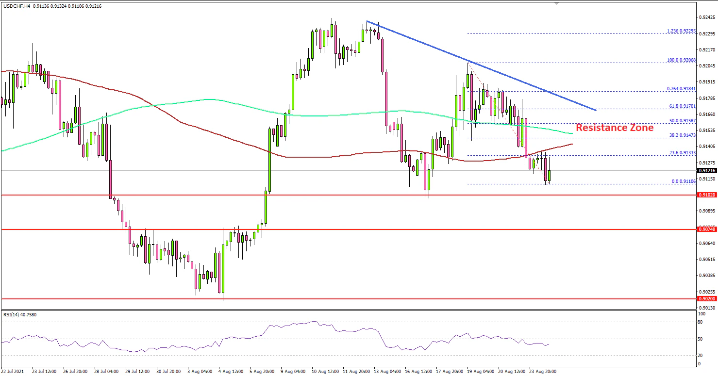 It even broke the 0.9150 support level and traded close to 0.9100. It is now consolidating losses above the 0.9100 zone. On the upside, the pair could face sellers near the 0.9150 level.