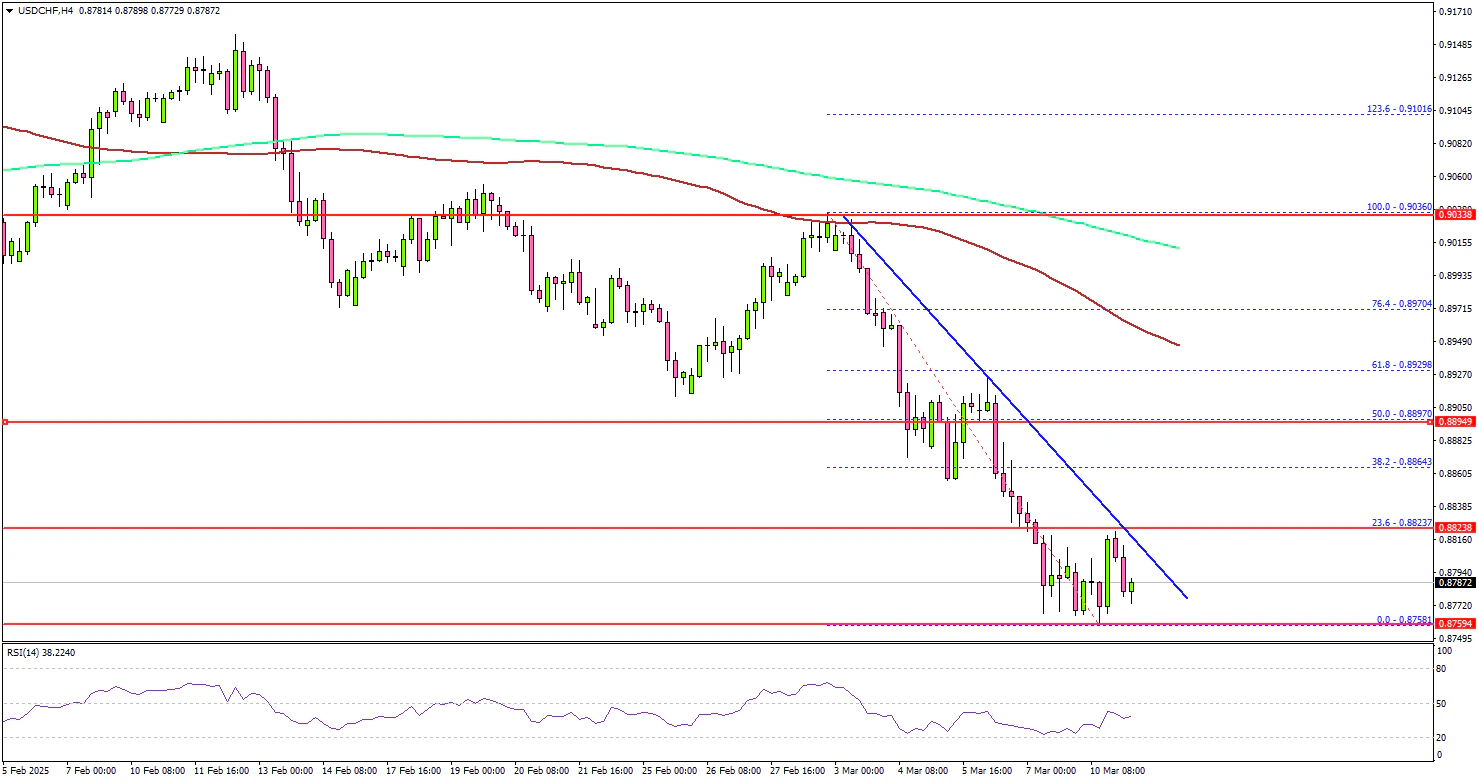 The US Dollar remained in a bearish zone below 0.8920 against the Swiss Franc. USD/CHF extended losses below 0.8850 to move further in a bearish zone.