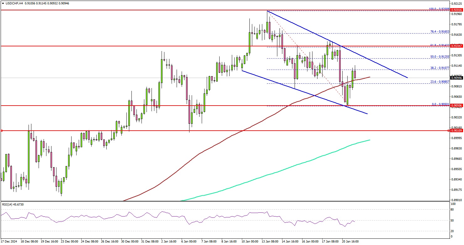 On the downside, immediate support sits near the 0.9050 level. The next key support sits near the 0.9020 level. Any more losses could send the pair toward the 0.9000 level and the 200 simple moving average (green, 4-hour).