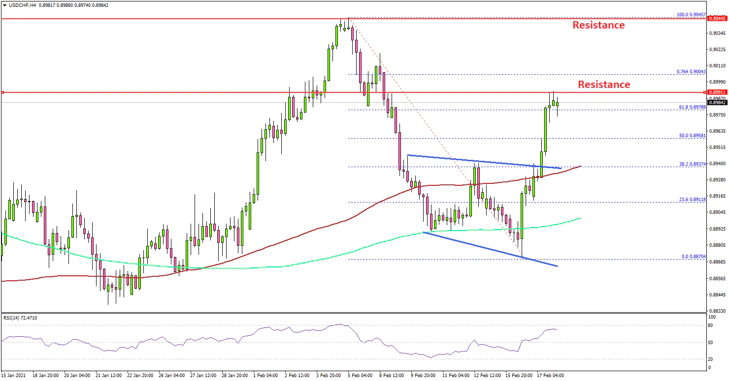 • USD/CHF found support near 0.8870 and started a fresh increase.