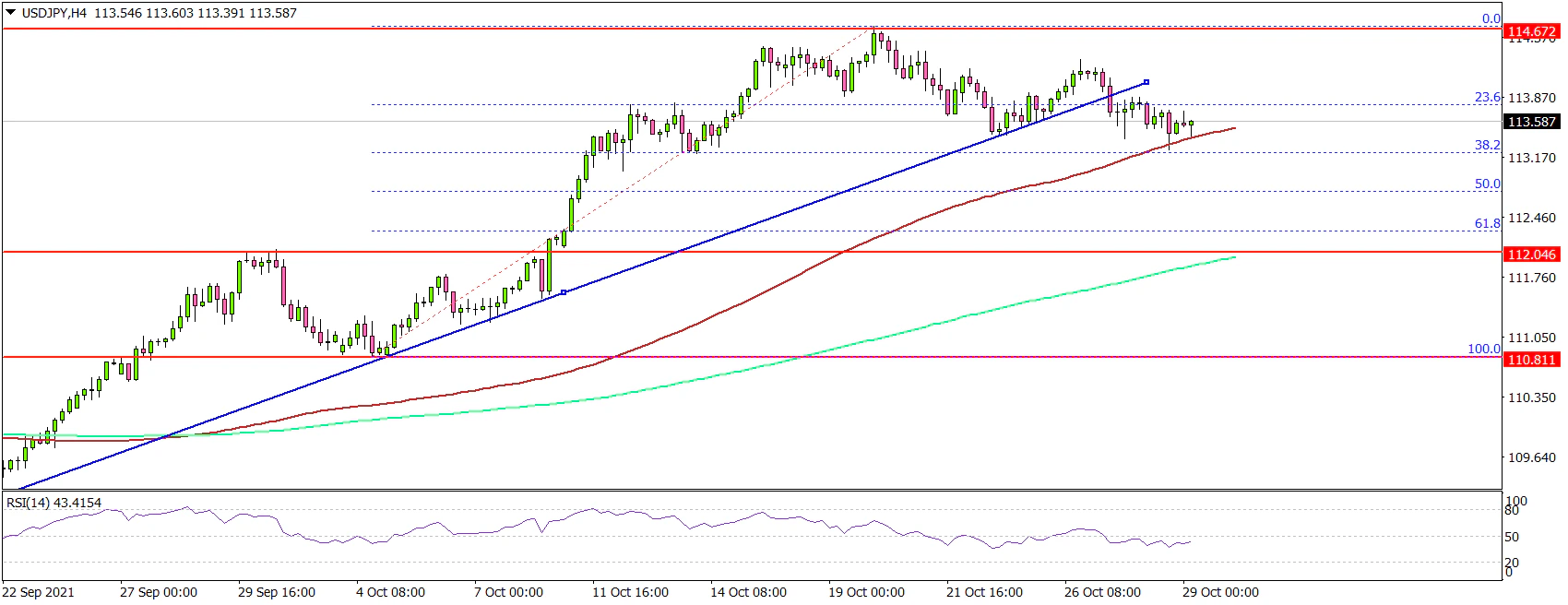 Looking at the 4-hours chart, the pair traded below the 114.00 support zone. The pair even traded below the 113.80 level, but the pair remained stable above the 100 simple moving average (red, 4-hours) and the 200 simple moving average (green, 4-hours).