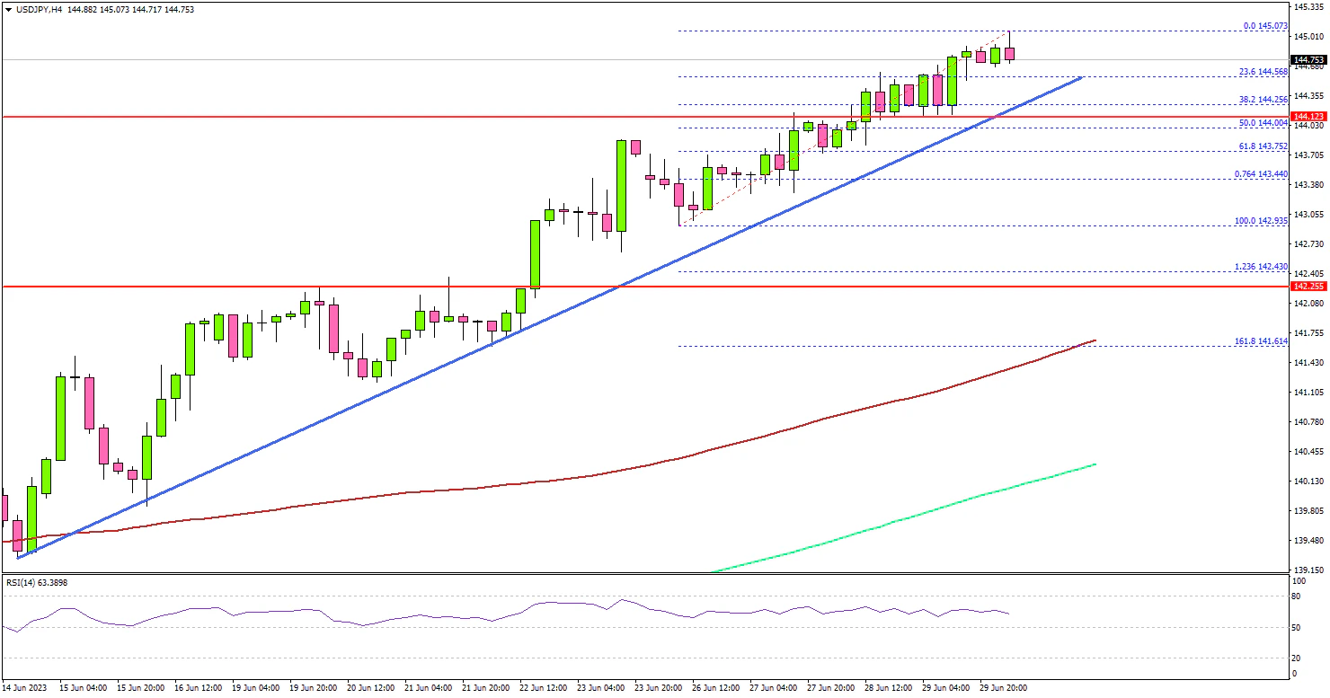 - A key bullish trend line is forming with support near 144.15 on the 4-hour chart.