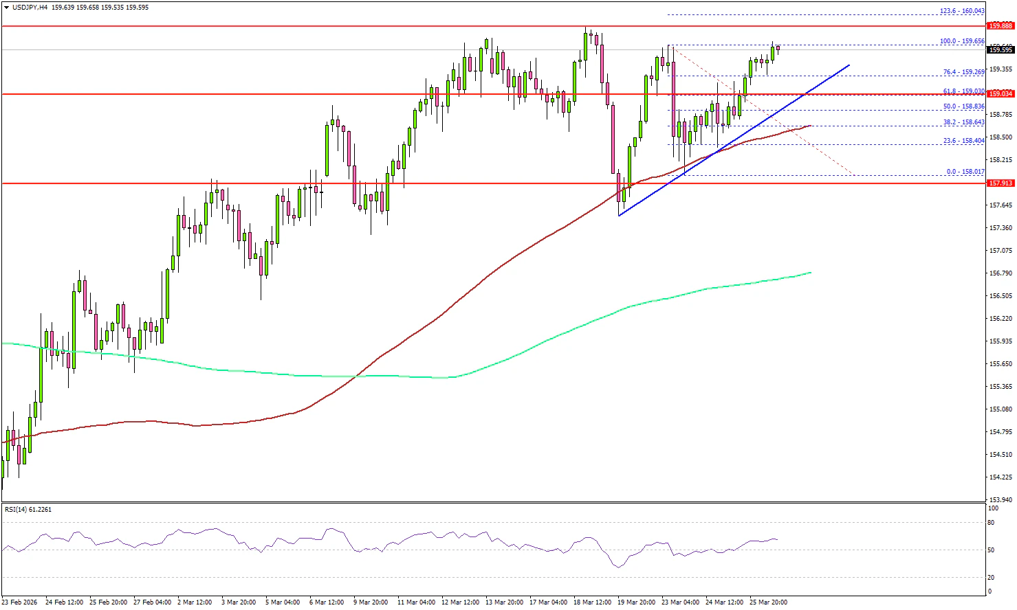 - USD/JPY started a fresh increase above 158.80 and 159.00.