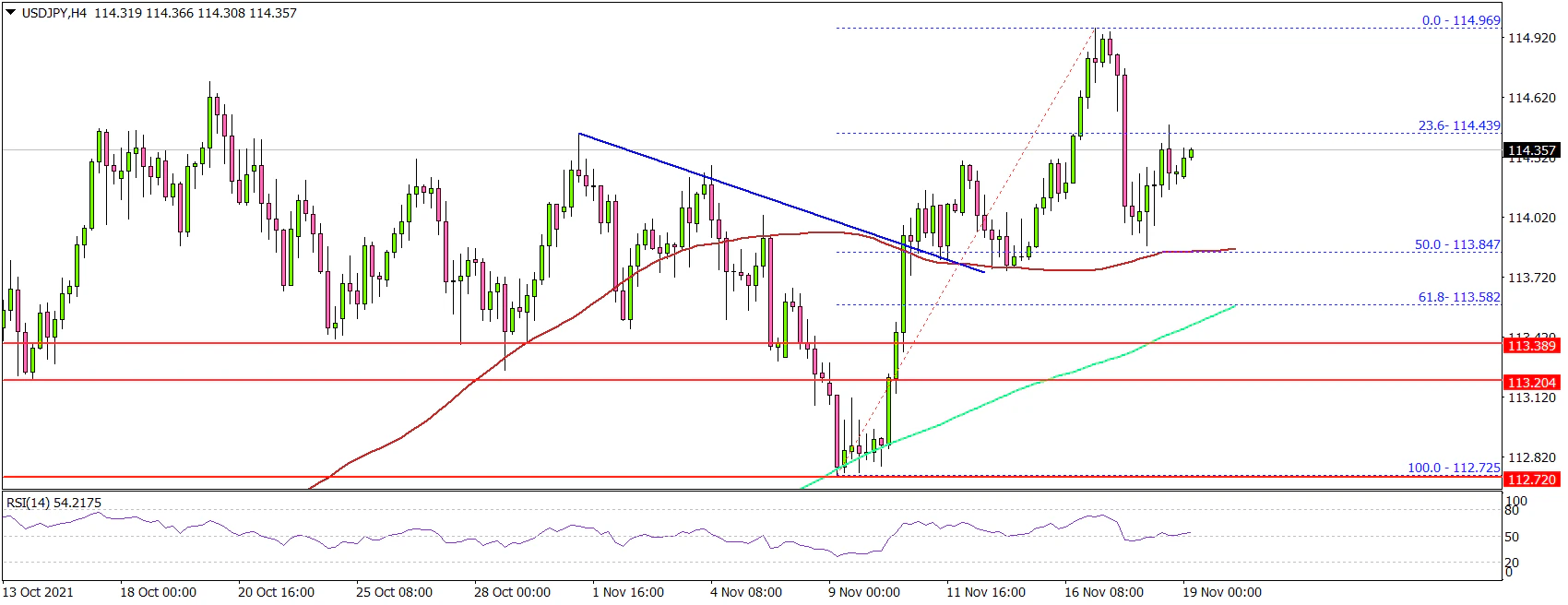 However, the bulls were active above the 113.80 level and the 100 simple moving average (red, 4-hours). The pair also remained stable above the 200 simple moving average (green, 4-hours).