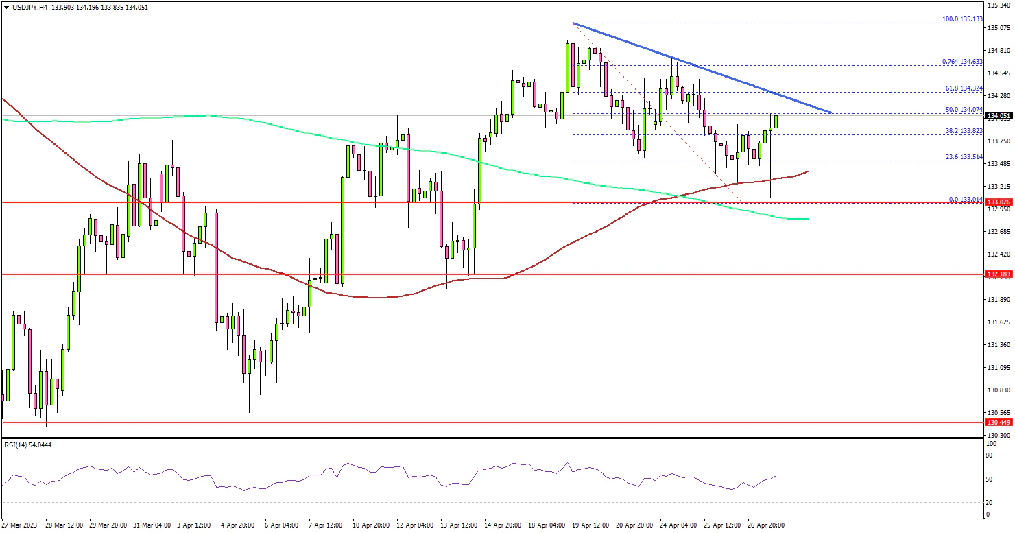 Looking at the 4-hour chart, the pair remained stable above the 133.00 zone, the 100 simple moving average (red, 4 hours), and the 200 simple moving average (green, 4 hours).