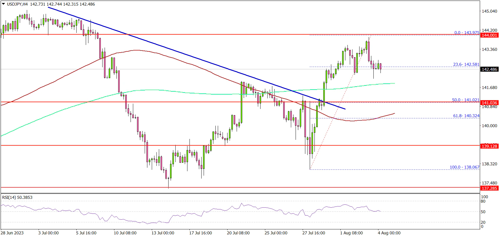 - It broke a key bearish trend line with resistance near 141.00 on the 4-hour chart.