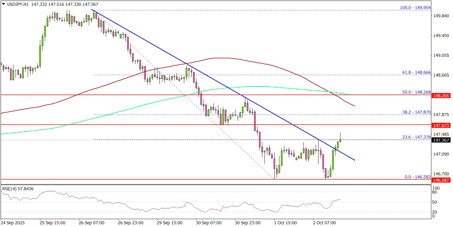 - It cleared a key bearish trend line with resistance near 147.20 on the 4-hour chart.
