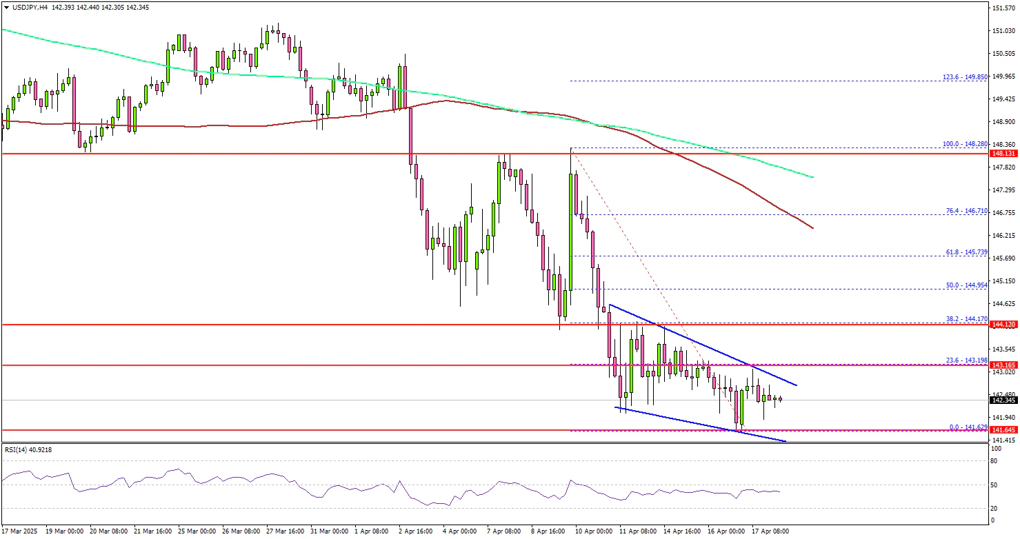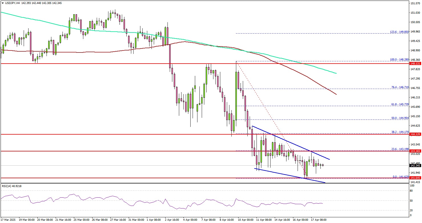 A low was formed at 141.62 and the pair is now consolidating losses. If there is a fresh increase, the pair could face resistance near the 143.10 level. There is also a short-term contracting triangle forming with resistance at 143.10 on the same chart.