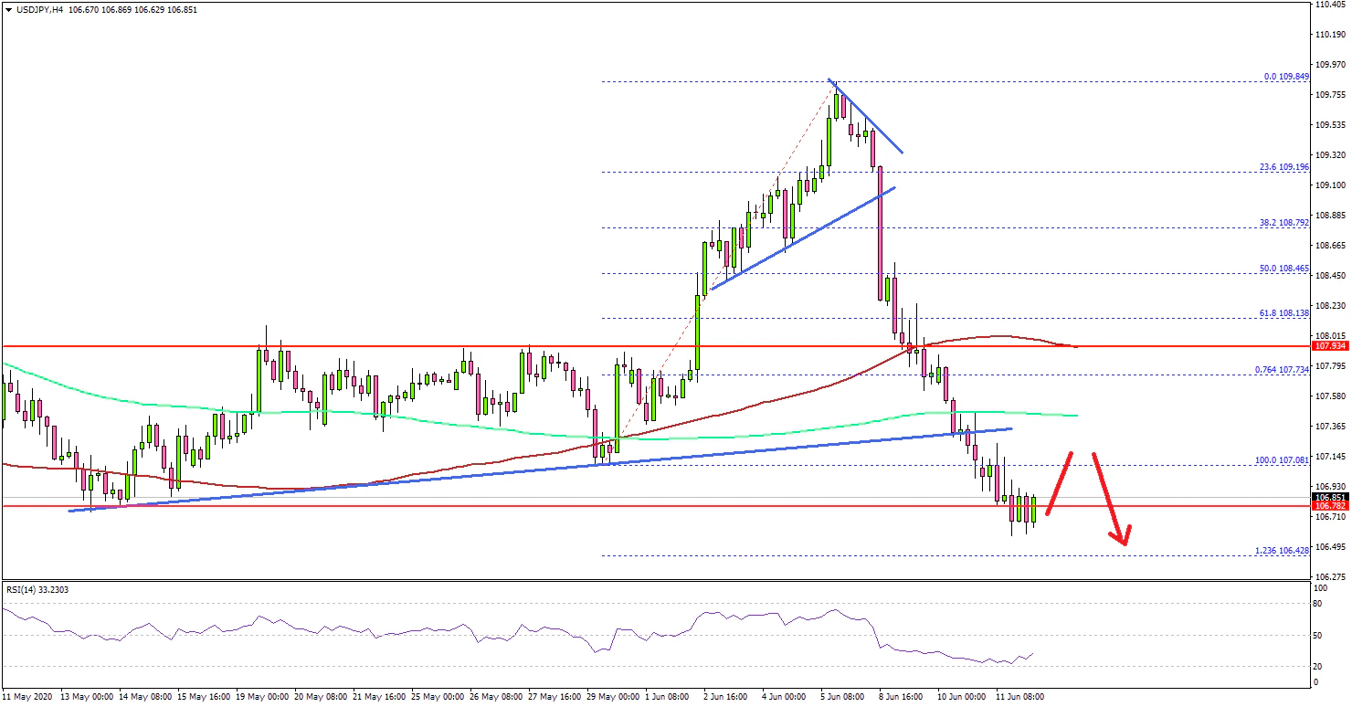There was a break below a connecting bullish trend line with support at 107.35 on the same chart. Besides, the pair settled traded below the last swing low at 107.08, plus settled below the 100 simple moving average (red, 4-hours) and the 200 simple moving average (green, 4-hours).